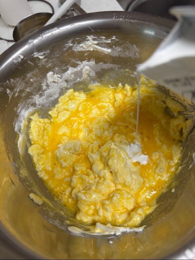 卵を少しずつ加えてその都度よく混ぜ、次に生クリームを加えます。