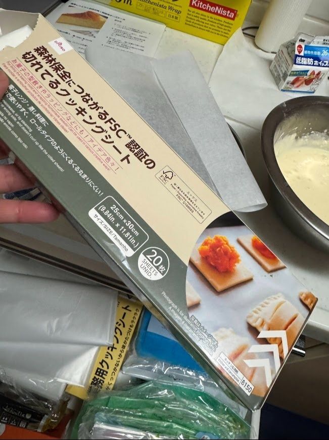 クッキングシート(100均の切れているクッキングシートが便利です)を型に敷きます。