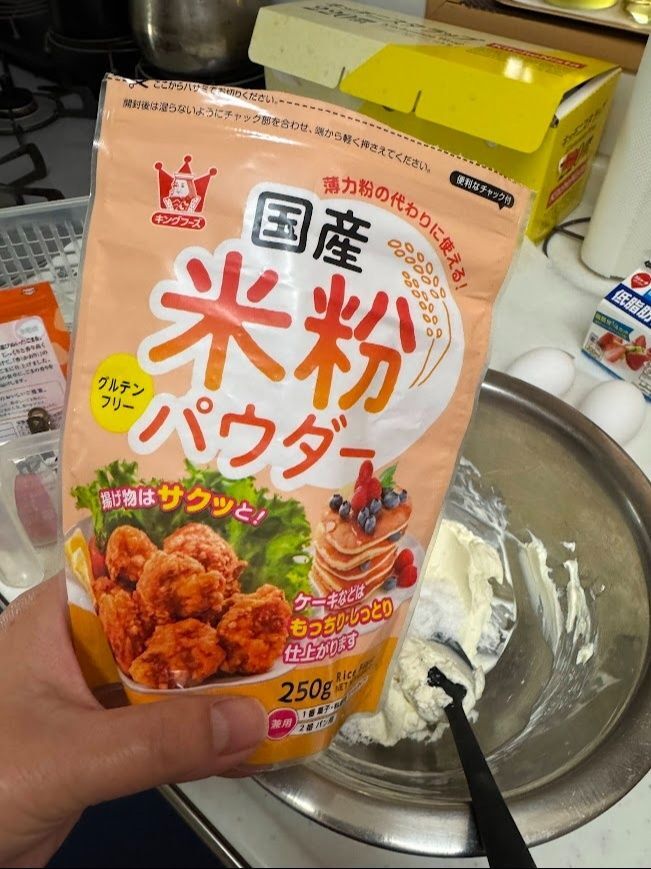米粉をそのまま入れてゴムベラで切るように混ぜます。(米粉は同量の薄力粉で代用可能ですが、ふるいにかけてください)