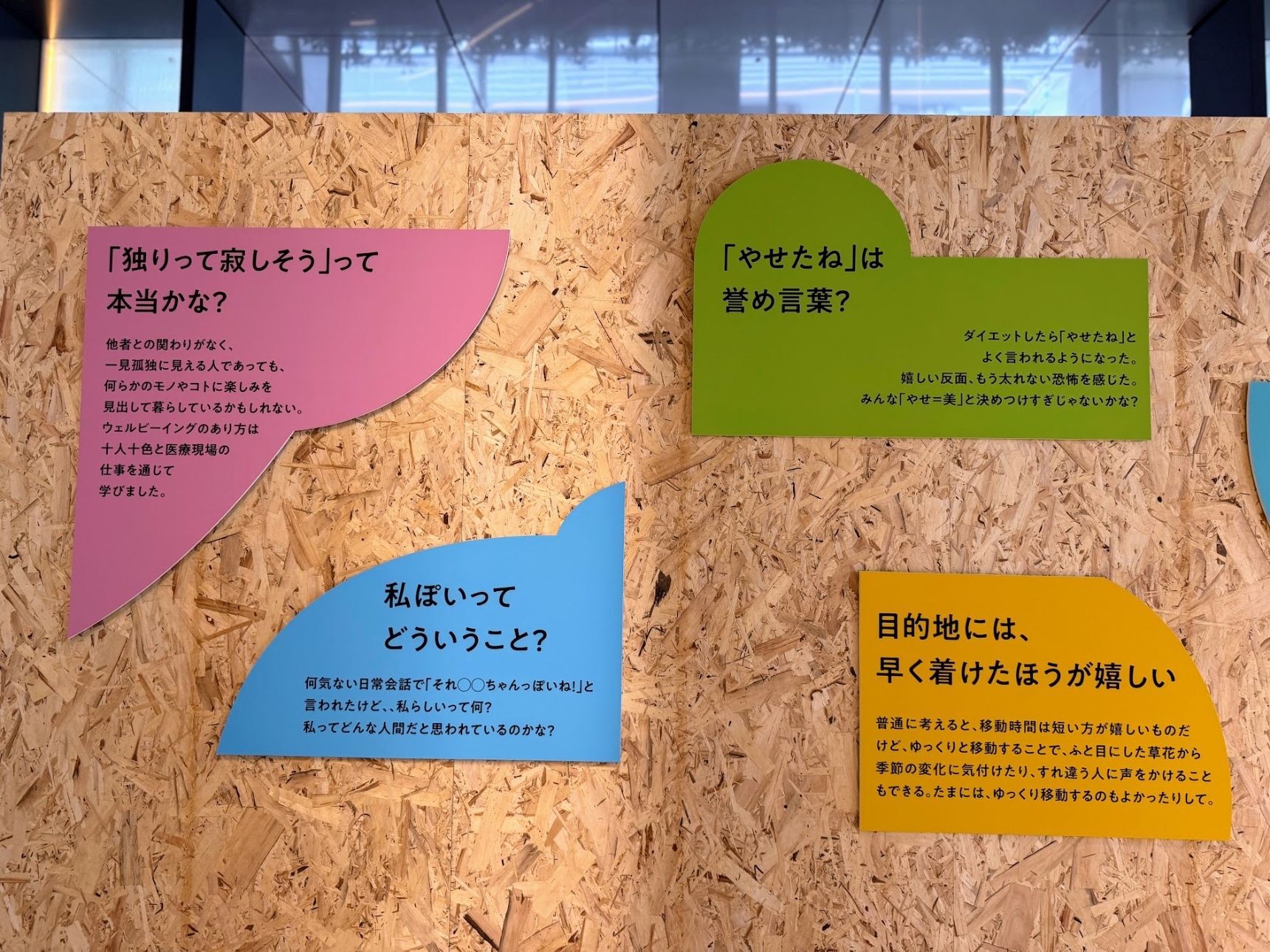 『みんなの違和館』展示は、カラフルなカードに違和感を感じた言葉がわかりやすく書かれています。