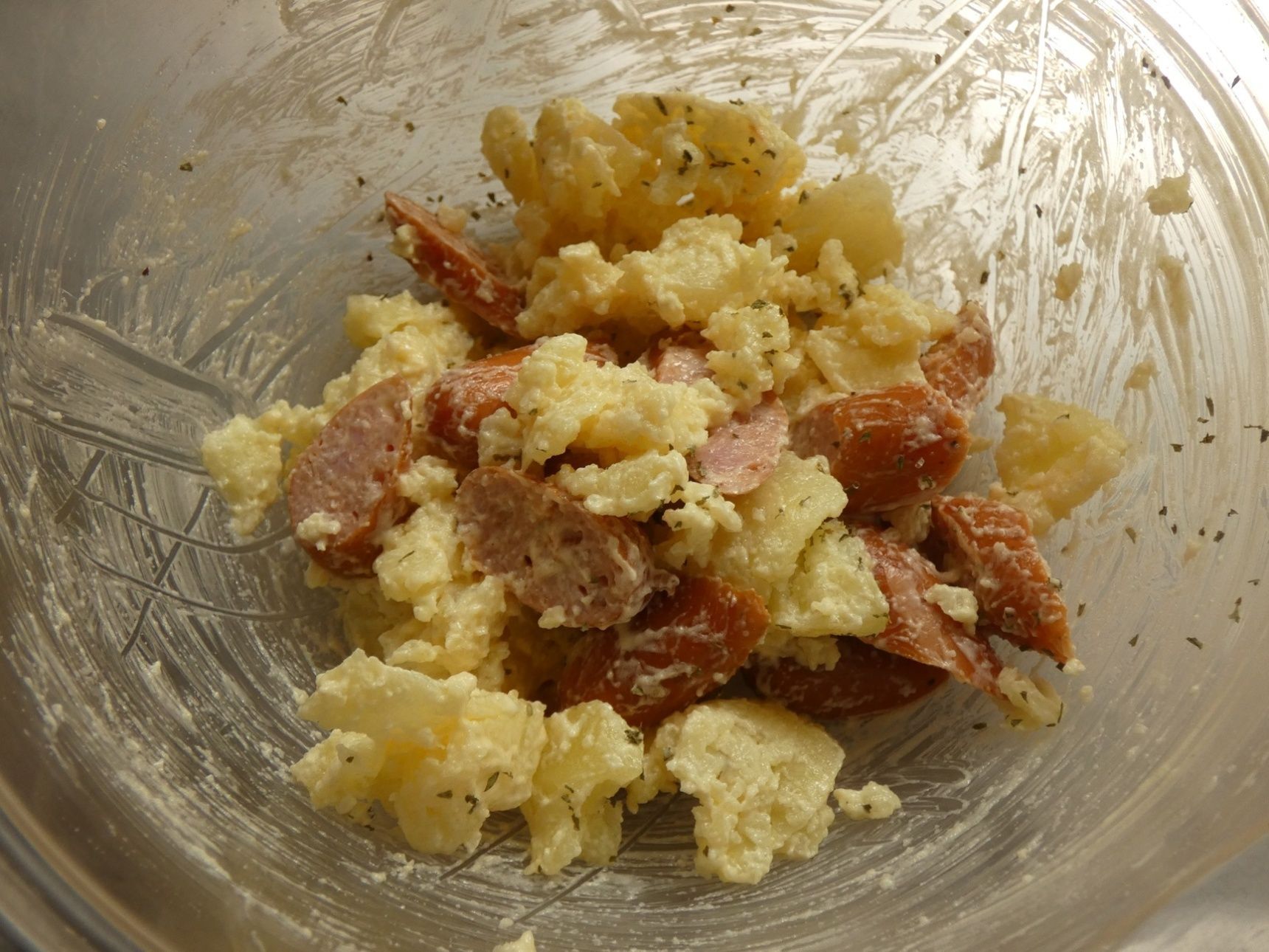 チョリソーを小さく切り、じゃがいもとマヨネーズ、塩とパセリを混ぜて完成。