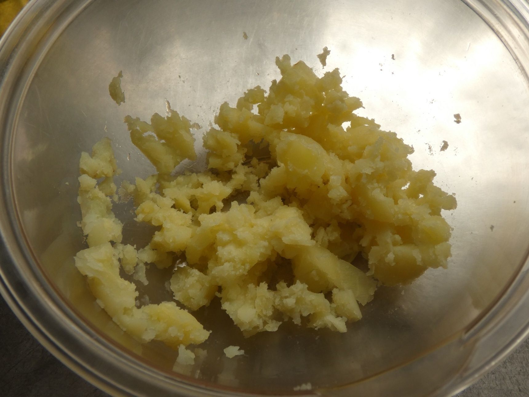 じゃがいもは小さく切ります。耐熱容器に入れてふんわりラップをし、電子レンジ600Wで3分加熱してつぶします。