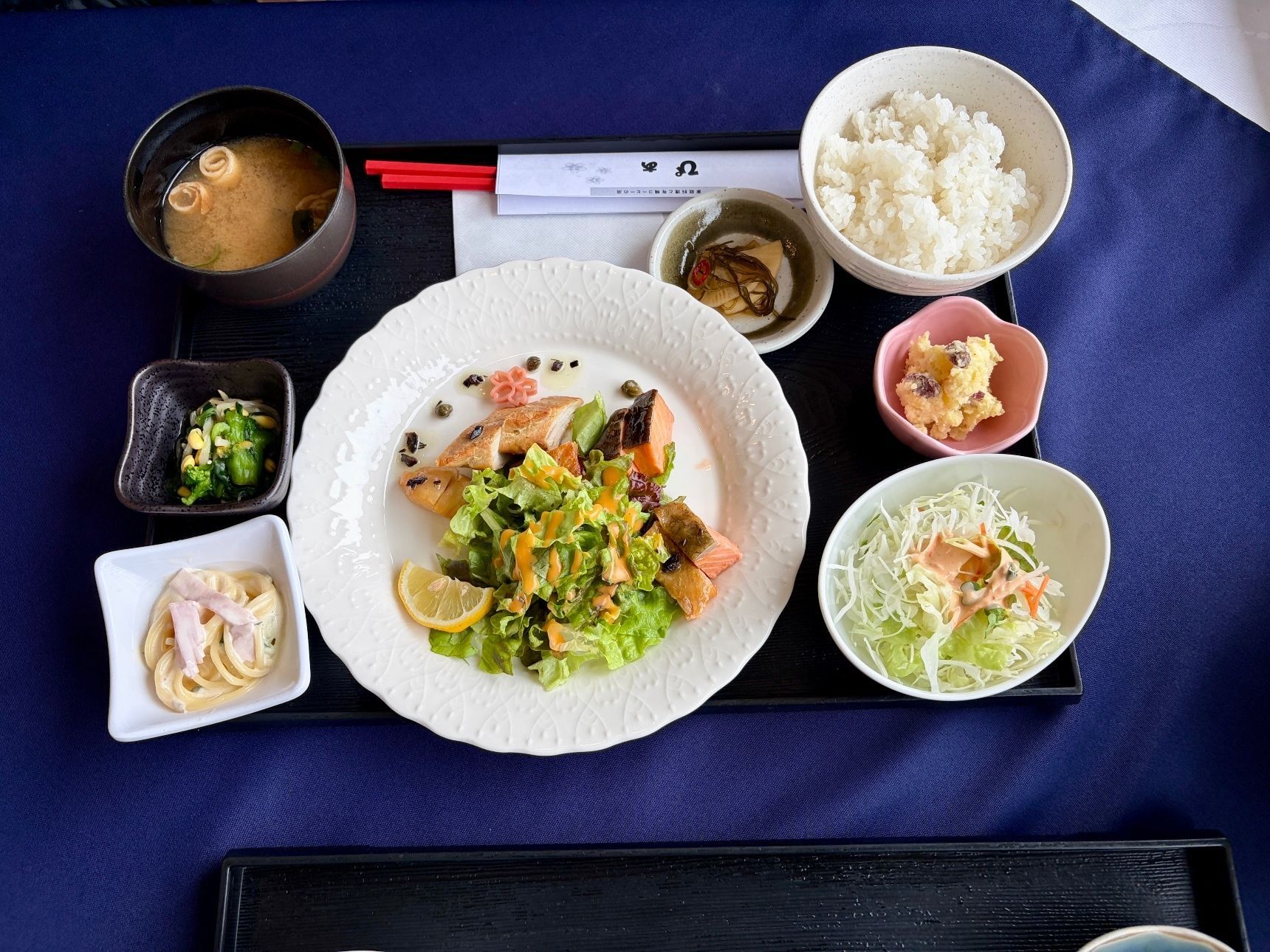 銀鮭(女川産・養殖)、メカジキ(宮城漁港水揚げ)、帆立(南三陸・養殖)に加え、小鉢3種(パスタサラダ、レーズンとさつまいものバター煮、菜花と豆もやしの柚子風味和え)付き。サラダ、ご飯、味噌汁(仙台味噌使用)もセットになっています。
