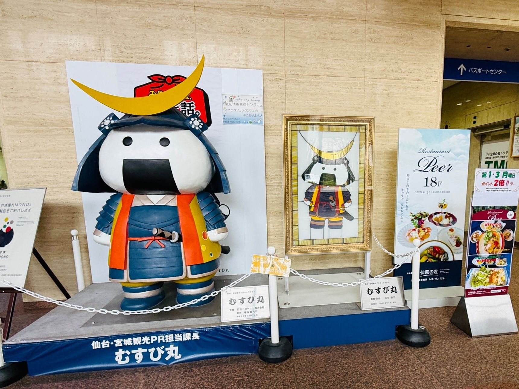 宮城県庁1階では、仙台・宮城観光PRキャラクターむすび丸がお出迎えです。
