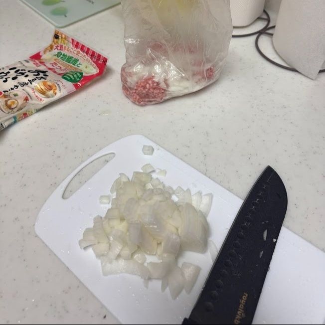 「新玉ねぎ」は粗みじん切りにします。ひき肉の入ったアイラップに炒めずに切った「新玉ねぎ」を入れます。
