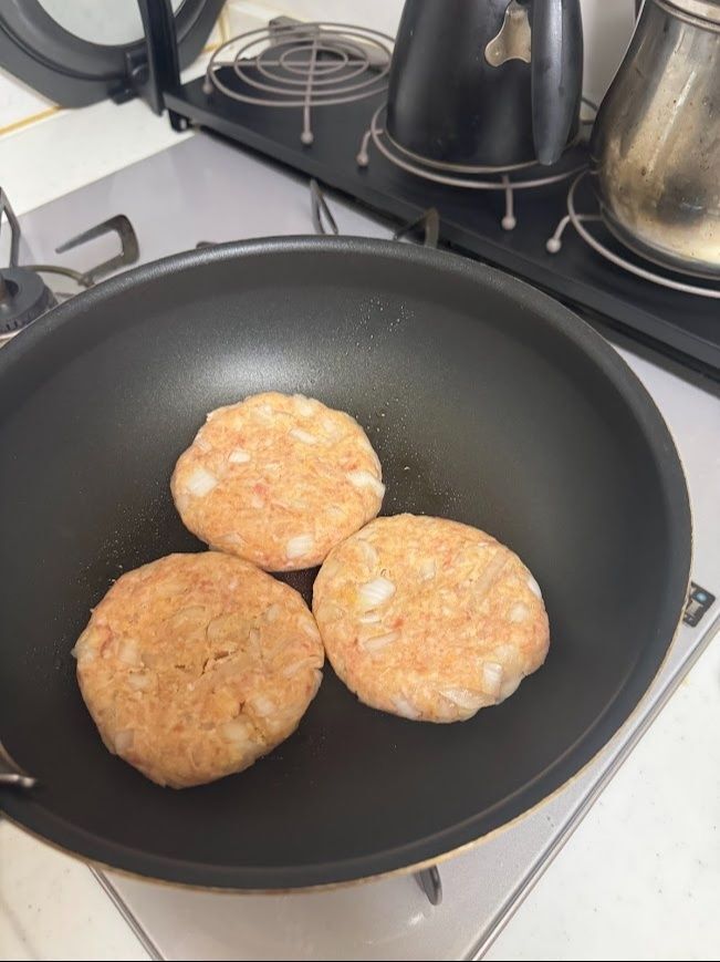 3等分して丸く形成したら、サラダ油を敷いたフライパンで焼きます。