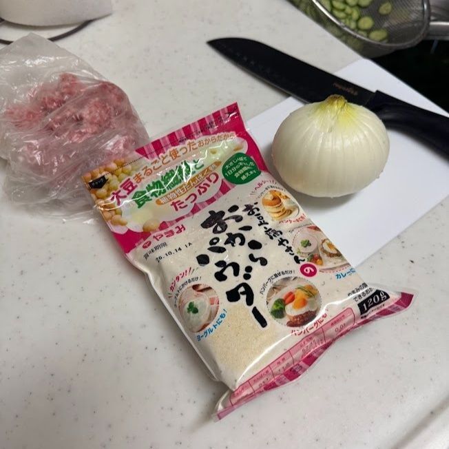 豚ひき肉と「新玉ねぎ」、つなぎはヘルシーにおからを使います。