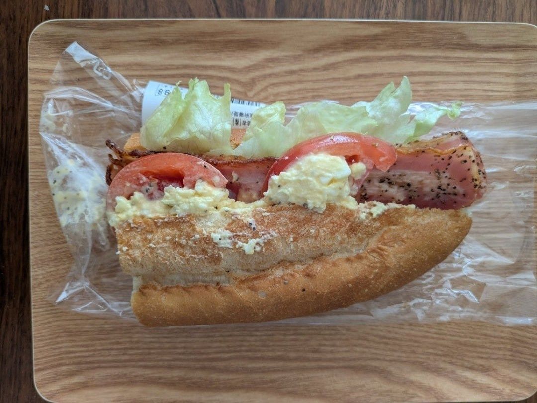 フランスパンにレタス・ベーコン・トマト・卵サラダがサンドされてブラックペッパーで味付けされたボリューム満点のサンドパンです!!