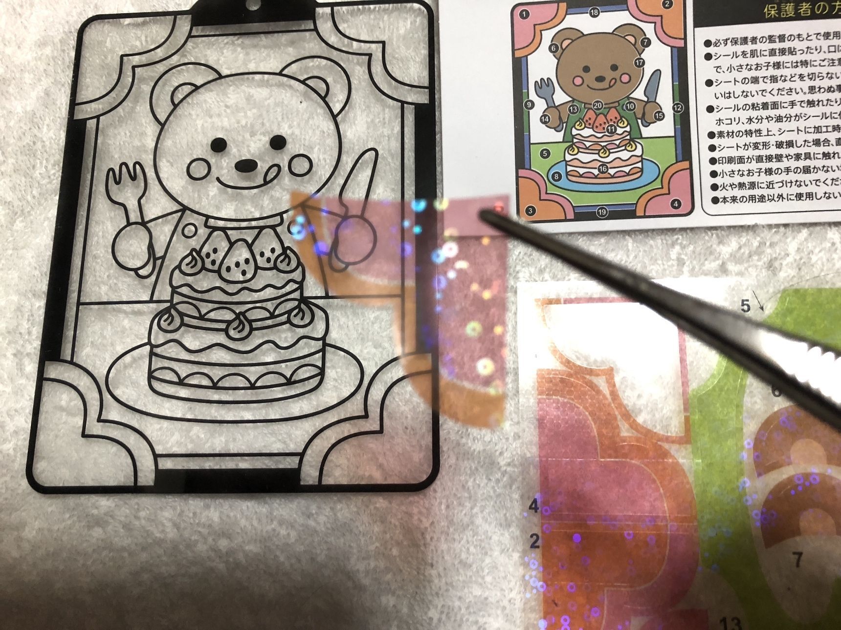 とうめいシート、シール、見本の絵を用意して番号を確認しながら貼っていきます。