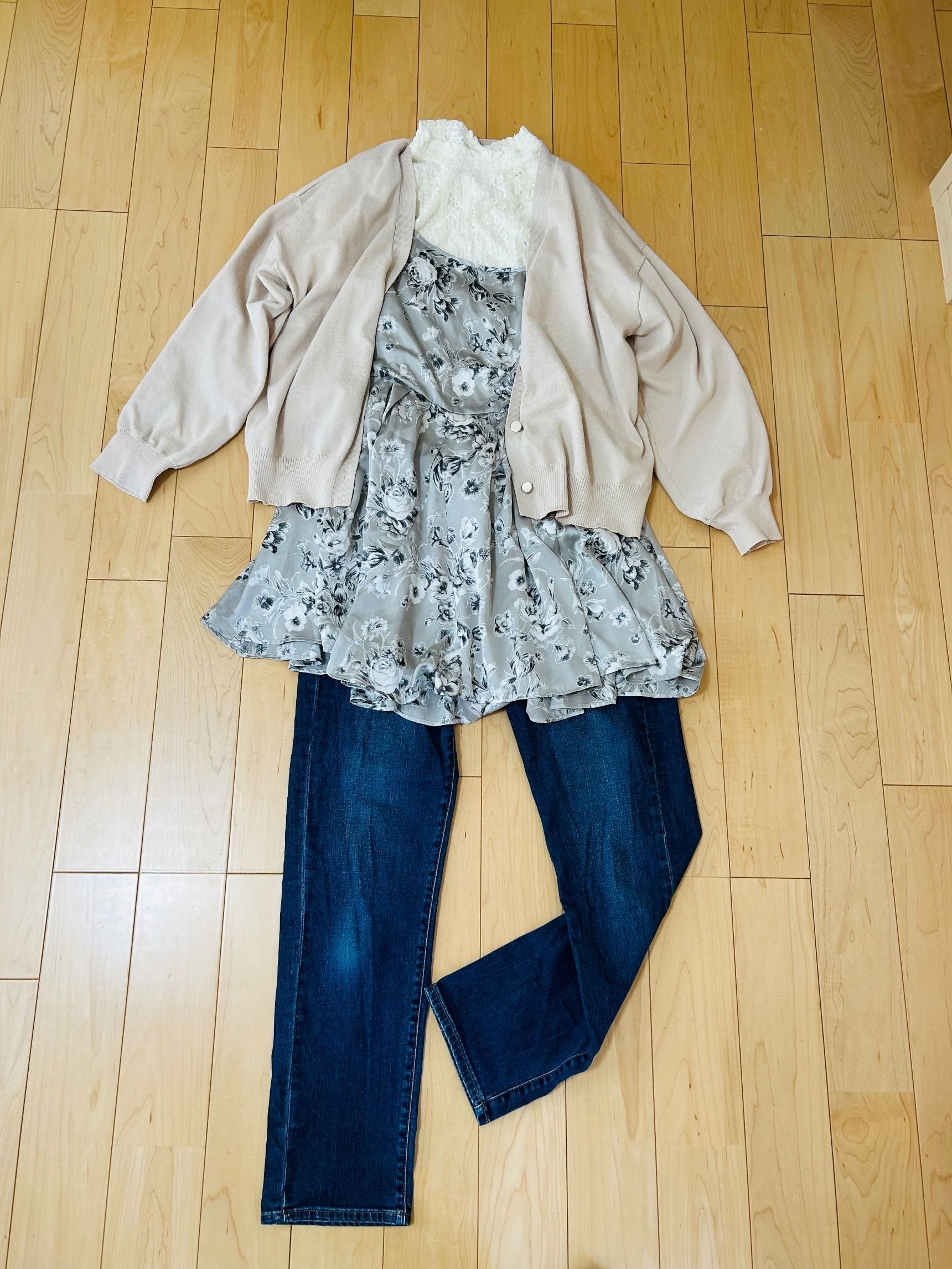 まだ、今の時期は肌寒いのでカーディガンを羽織ることにしました。ベージュ色のカーディガンが合いそうです。