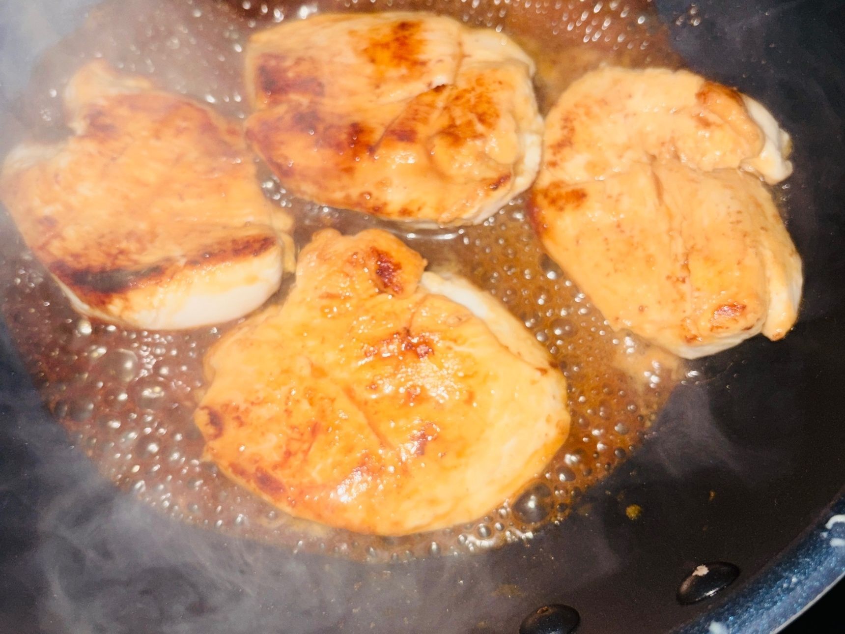 鶏むね肉の鍋照り焼きの隙間に、塩茹でしたブロッコリーを詰めます。
