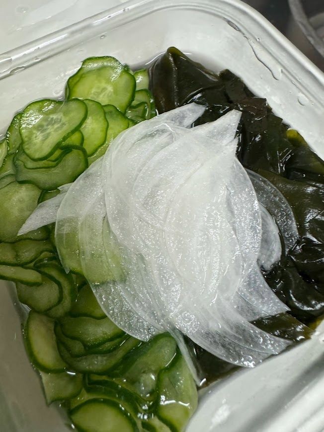全てを容器に入れてカンタン酢を廻しかけます。5分〜10分ほど冷蔵庫で寝かせると新玉ねぎの辛味がさらに抜け、わかめにも味が染みて格段に美味しくなります。