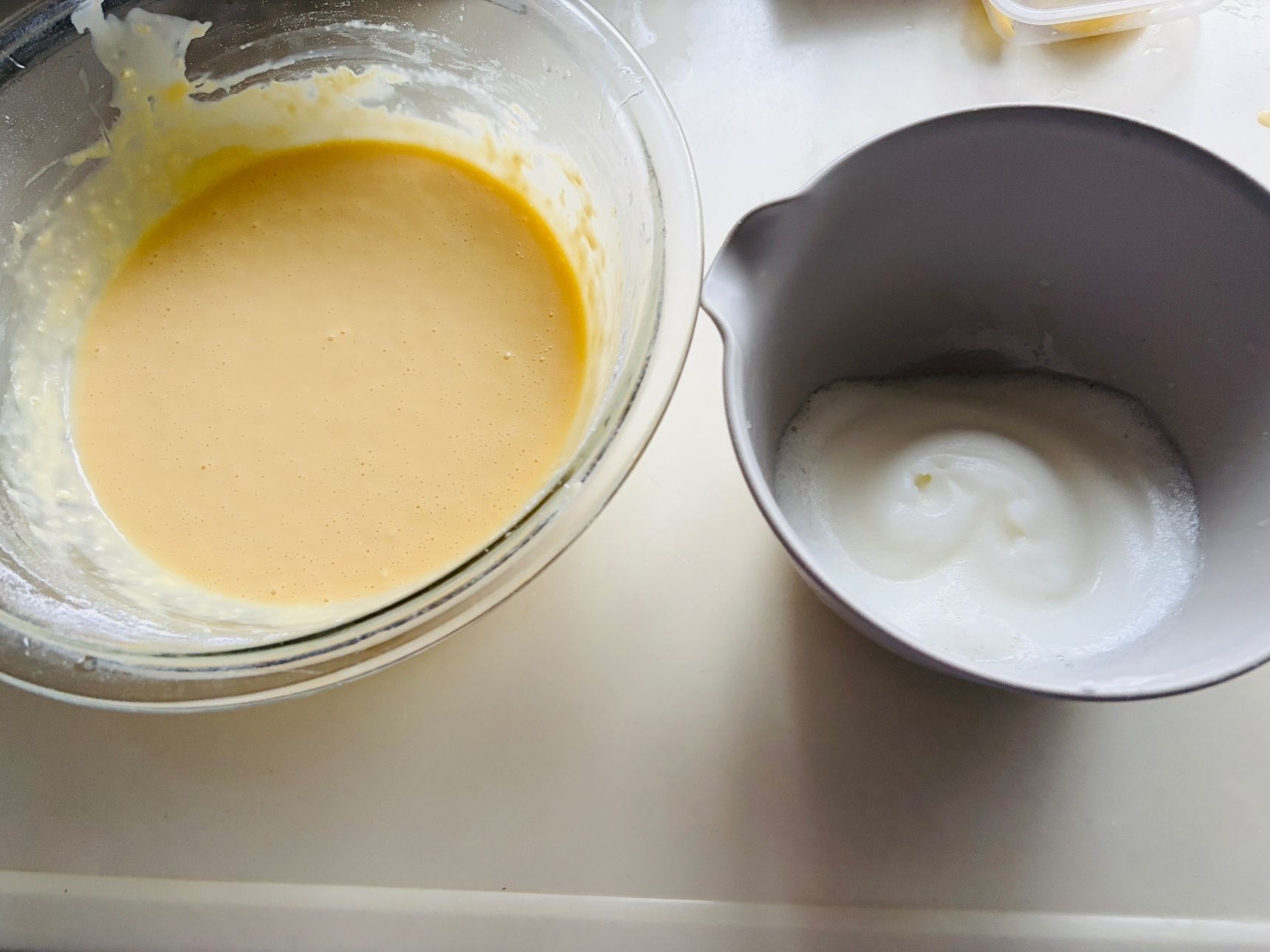 ①卵は卵白と卵黄に分けます。