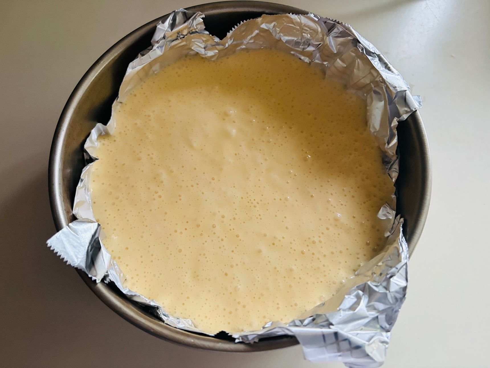 ④丸いケーキ型にくっつかないアルミシートを敷き、③を均一になるように流し入れます。両端を持って、トントンと台に落とし、空気を抜きます。