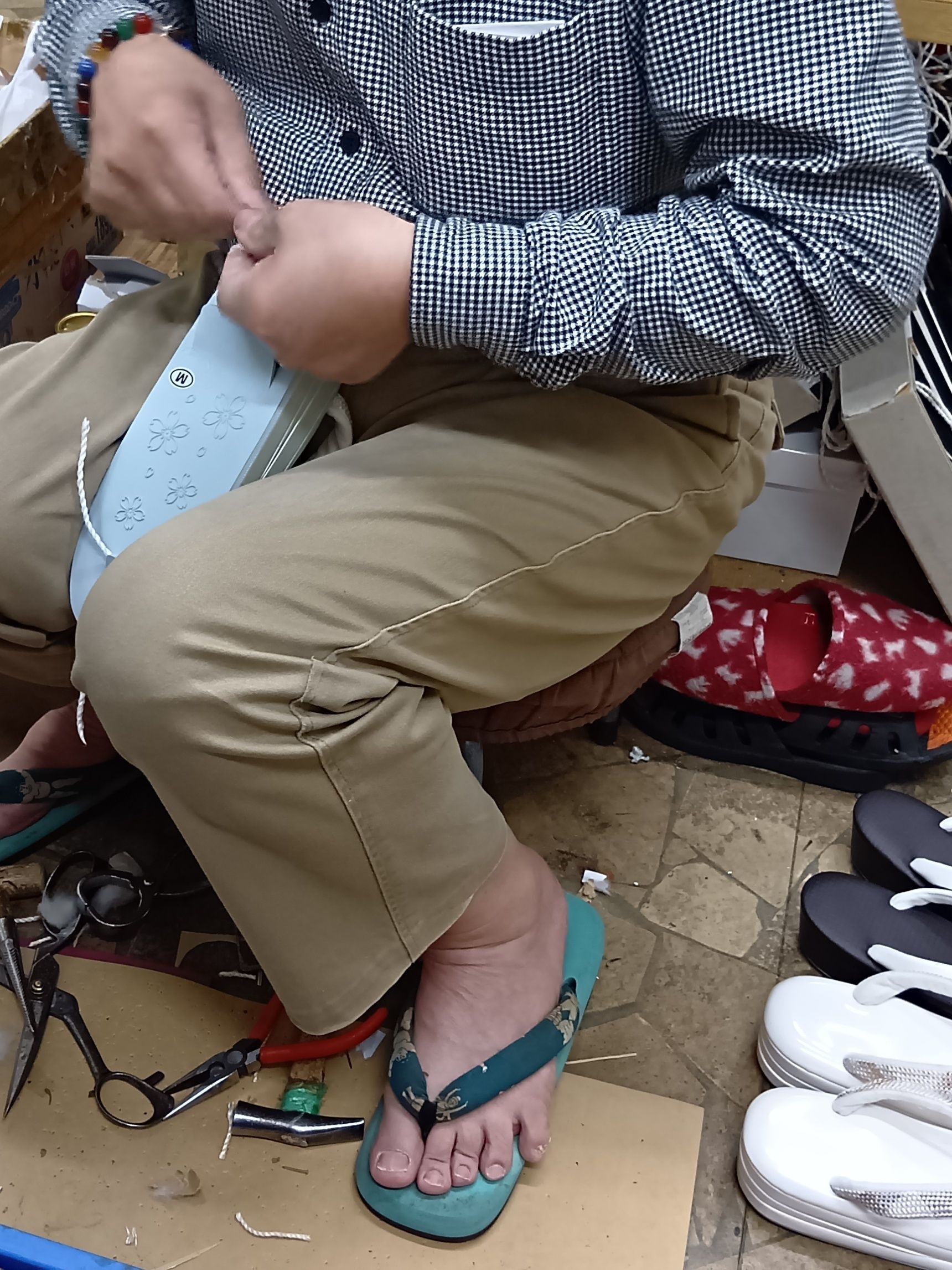 草履を作りながらいろいろお話を伺いましたが、購入後のメンテナンスもされていて、草履の調整や修理にも対応していただけるそうです。お店は開業から30年になるとのことでした。撮影許可頂いています。