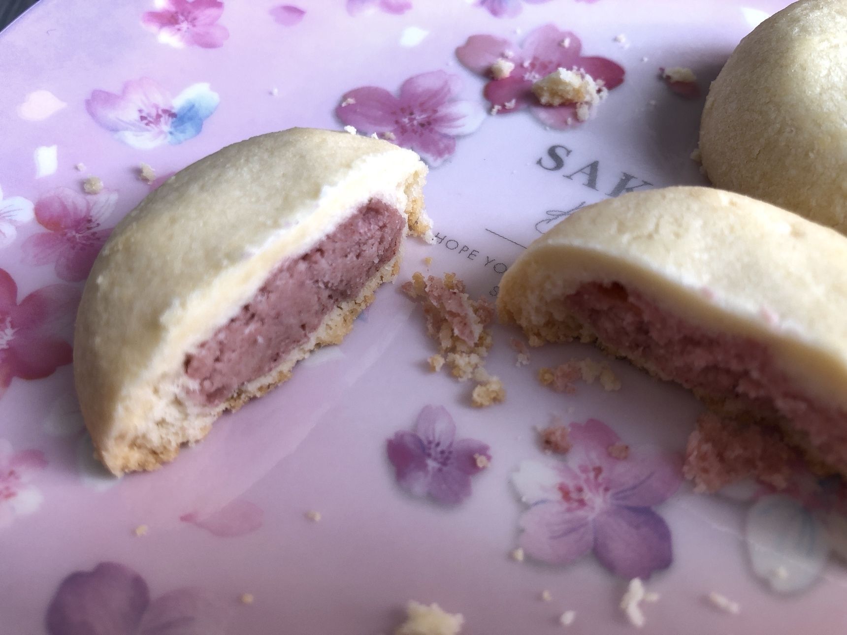 クッキーの内側にいちごのピンク色が隠れています。