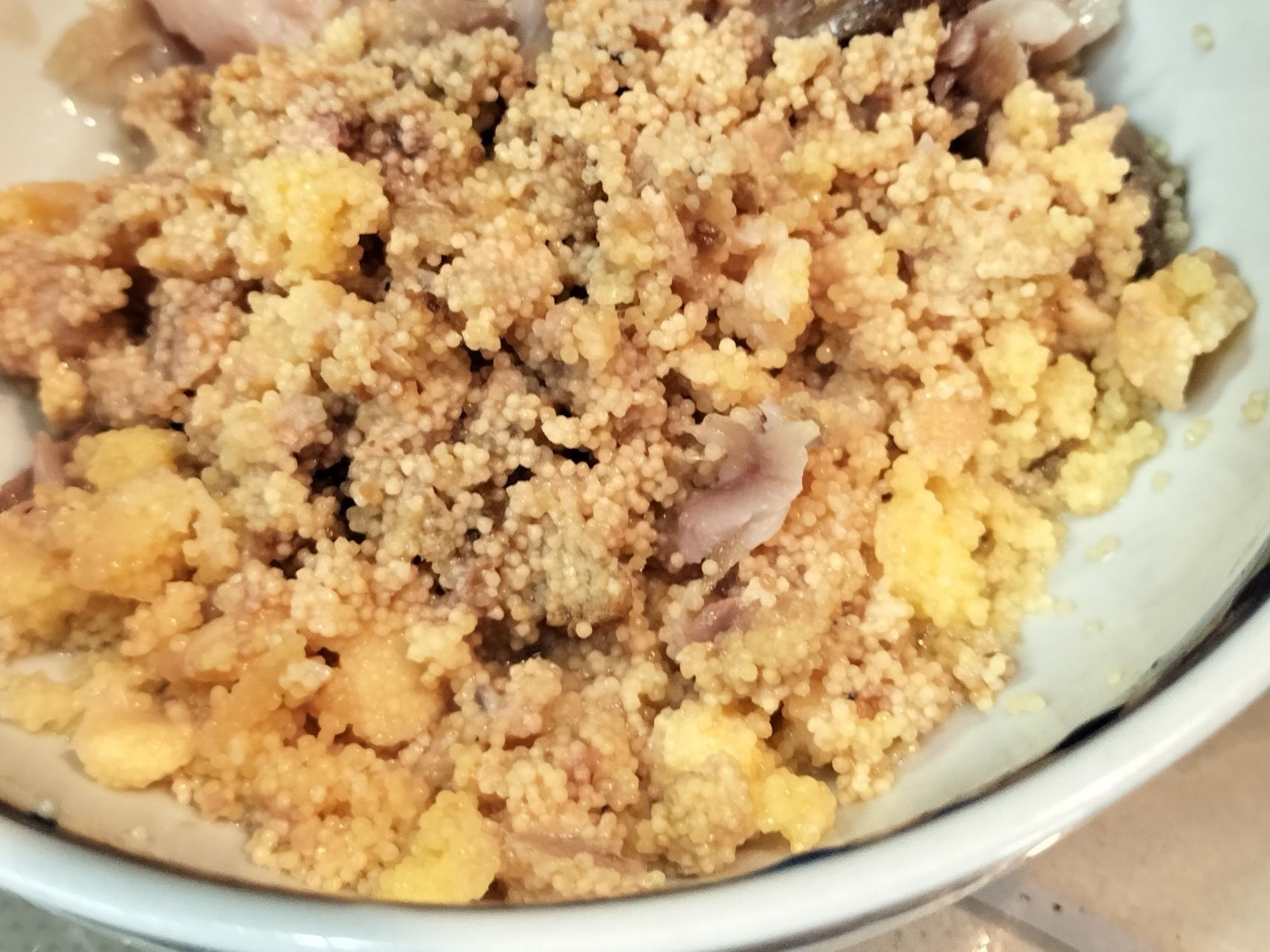 1、卵の周辺の身をほぐす→小骨を丁寧に取り除く→卵を崩す