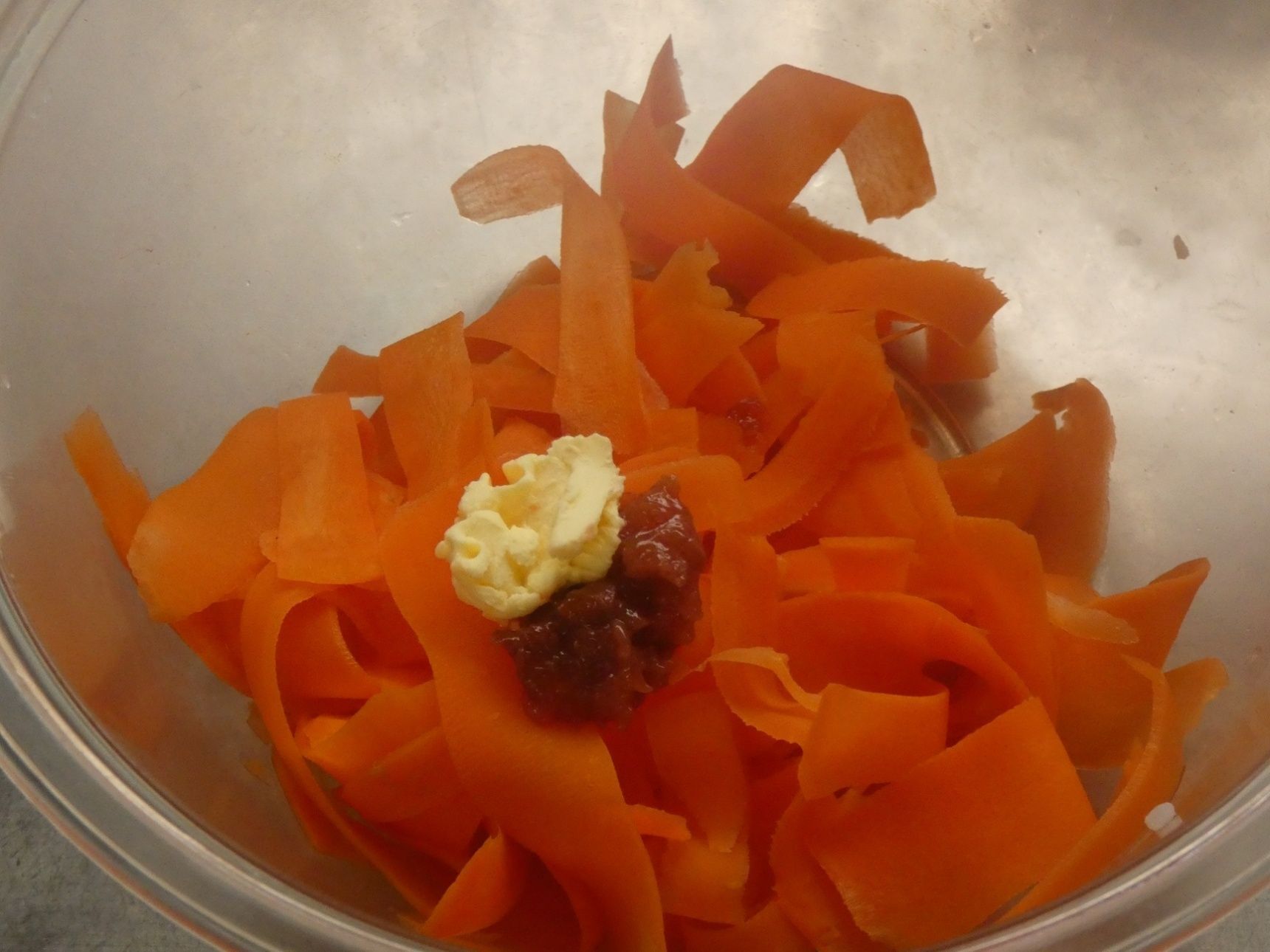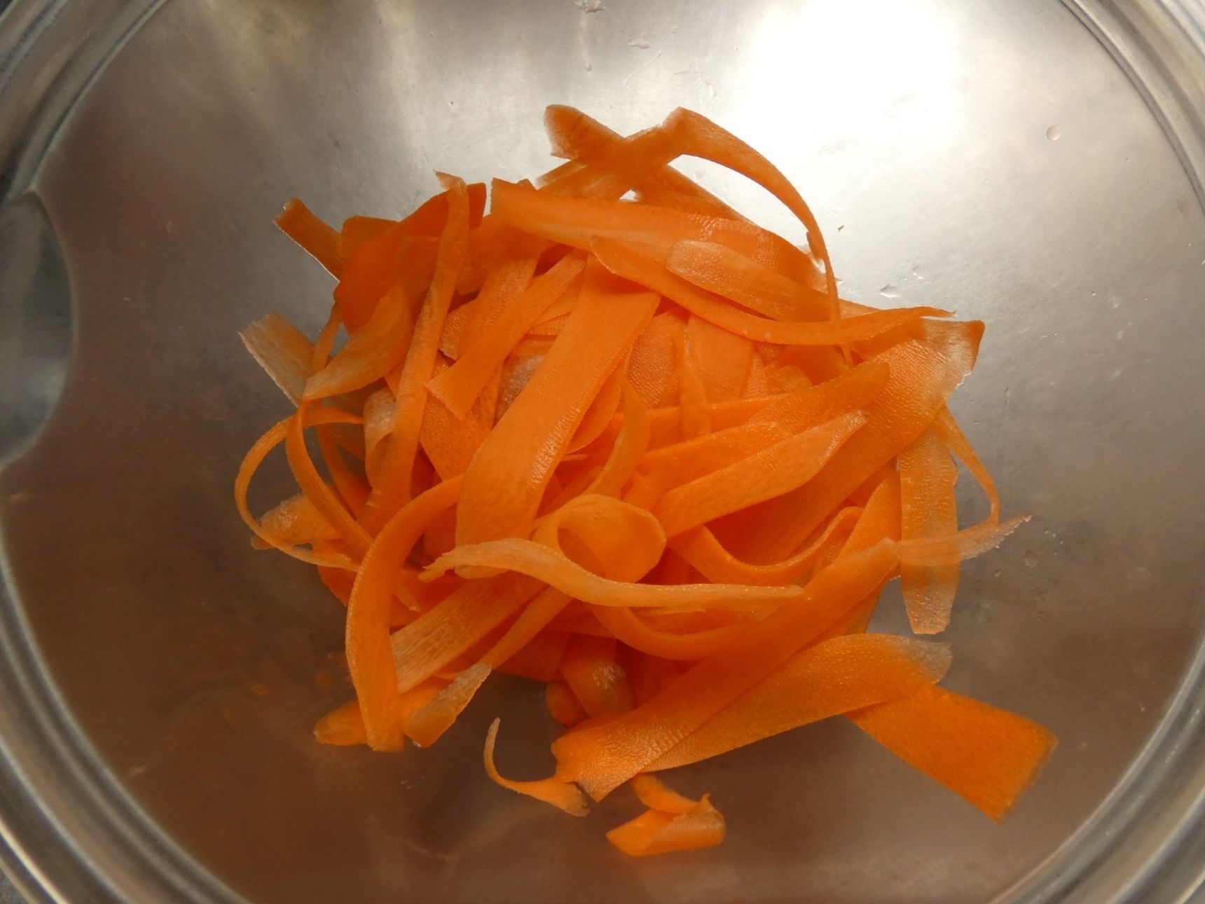 梅干しは種を取り除いて細かく切ります。にんじんはピーラーで薄く切ります。