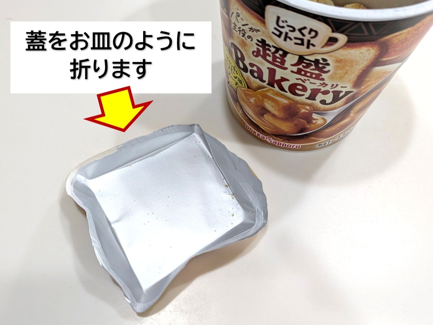 商品の蓋をお皿のようにして折り、そこにいったんパンを取り出します。