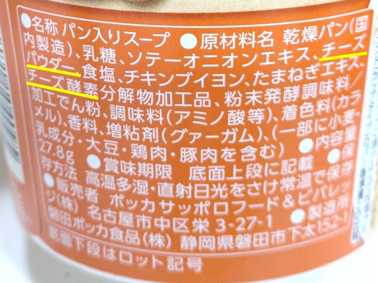 原材料も見てみると→チーズパウダー、チーズ酵素分解物加工品が入っています。