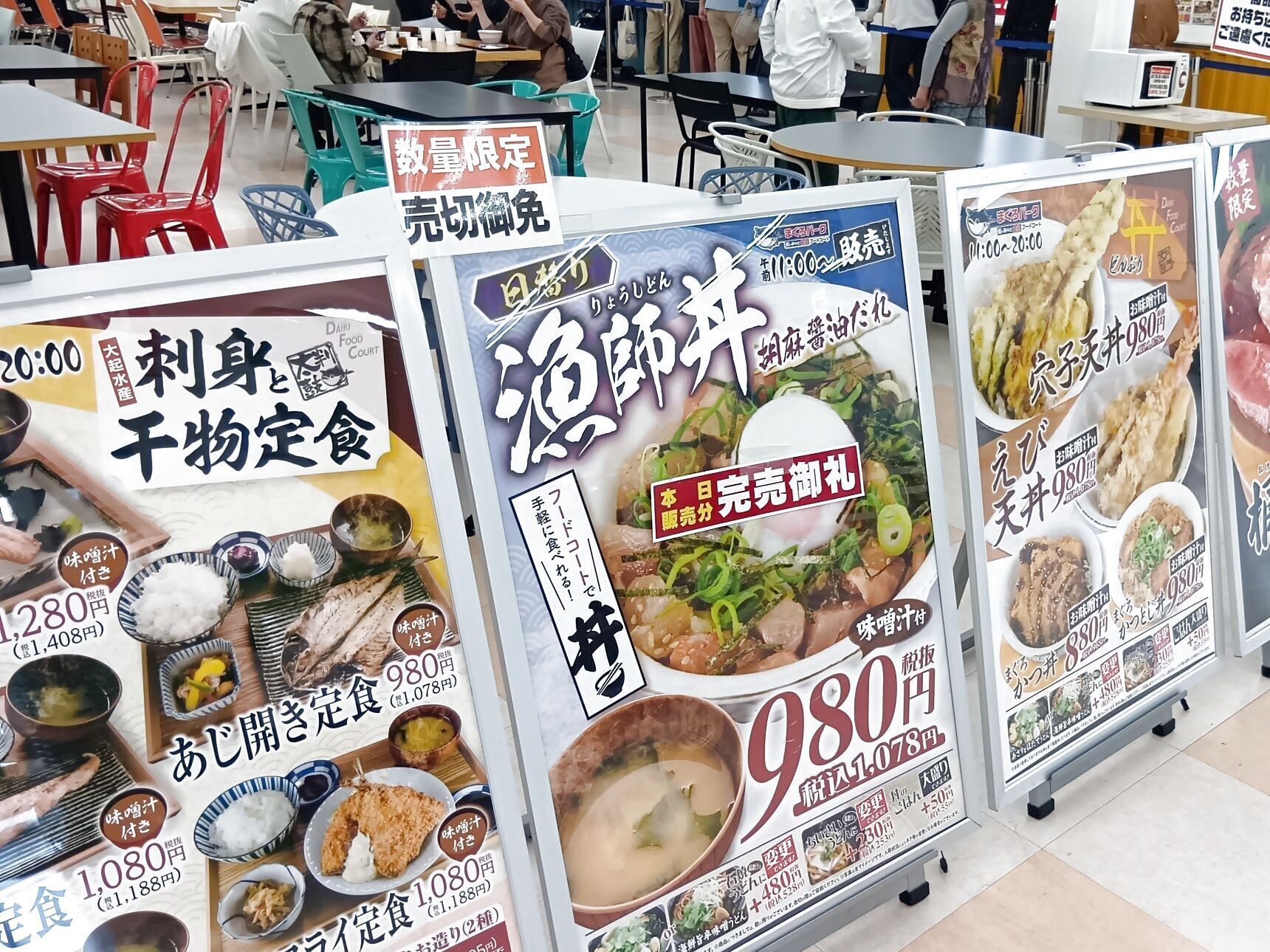 まぐろパークのフードコートは、まぐろ料理を中心に海鮮丼や定食などが楽しめる広々とした空間。新鮮な魚介を気軽に味わえるうえ、メニューも豊富で、家族連れにも人気のスポットです。