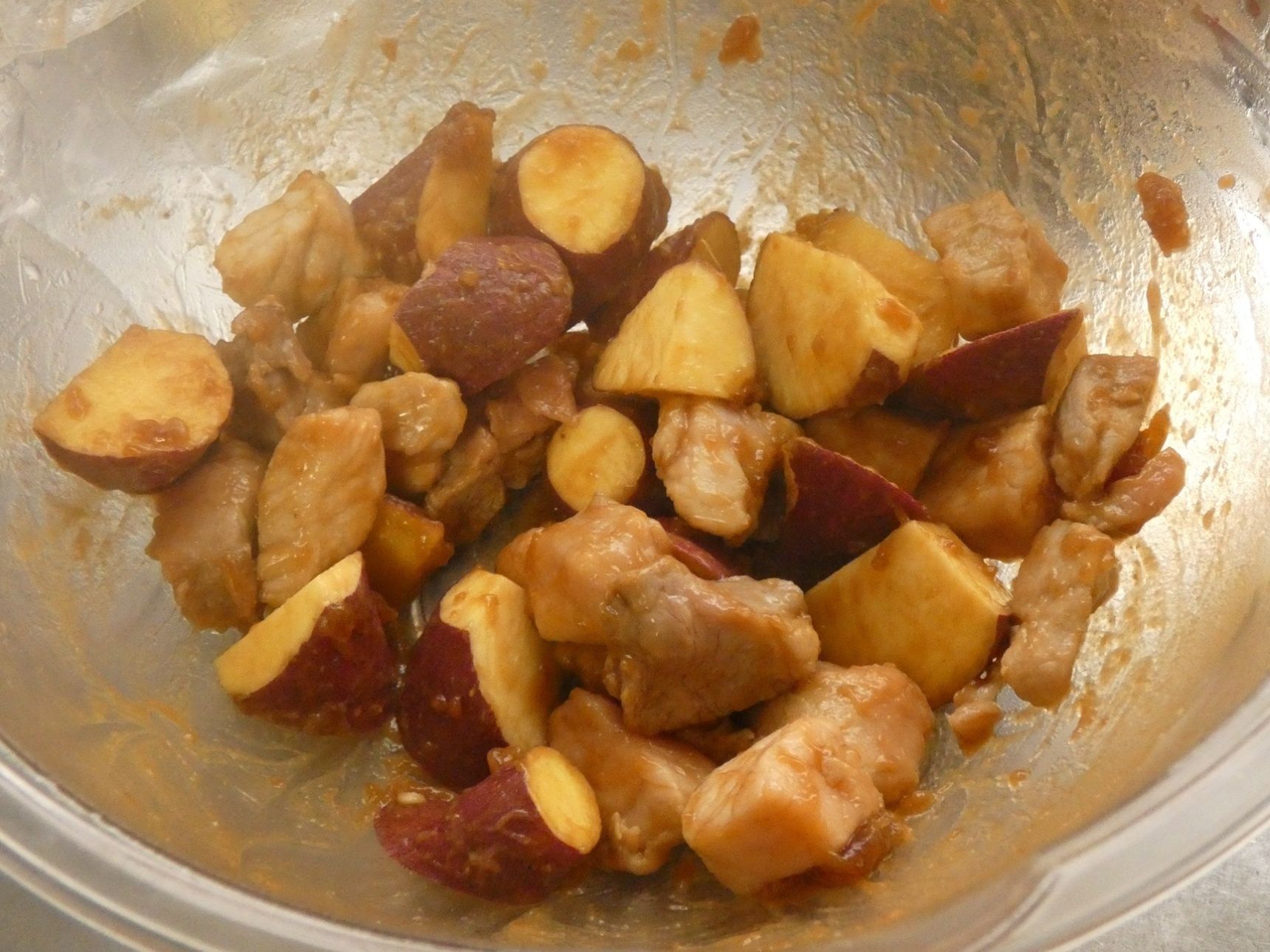 さつま芋と豚肉、Aを耐熱容器に入れてさっと混ぜます。ふんわりラップをし、電子レンジ600wで3分加熱します。