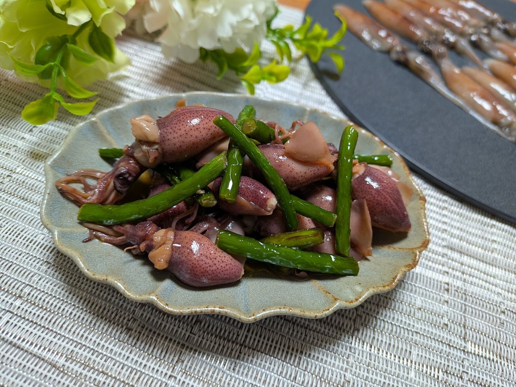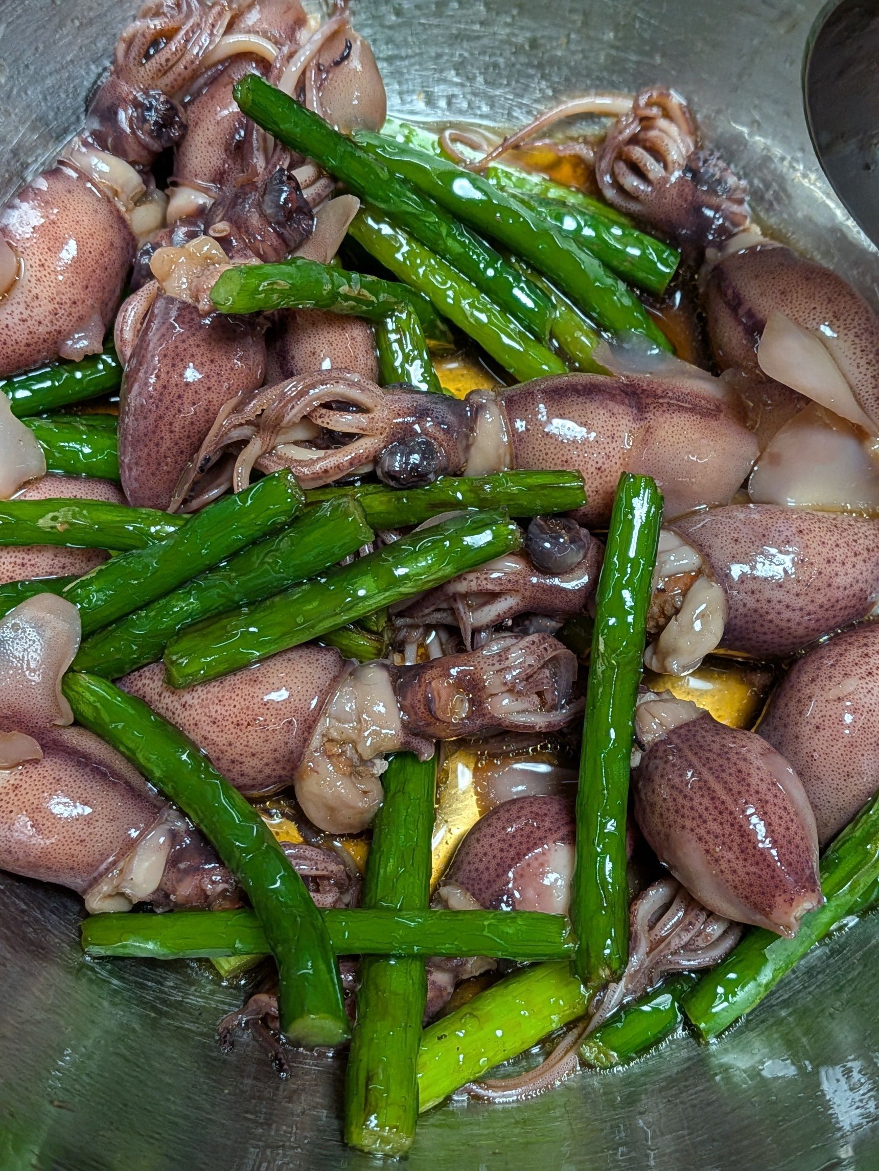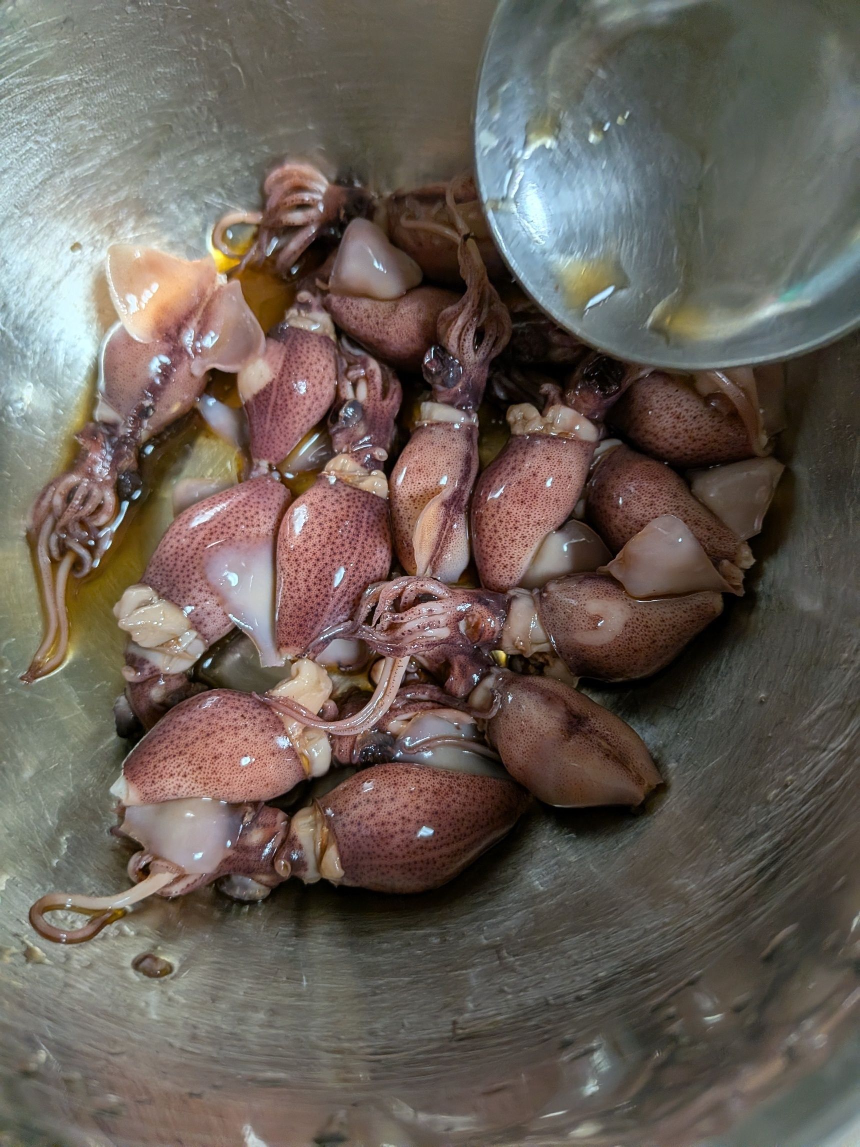にんにくの芽と香りのついたごま油もねこそぎほたるいかのボウルに入れて…