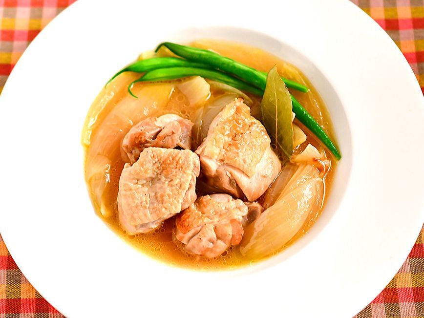 鍋にオリーブ油を入れて、鶏肉の表面が焦げ目のつくまで強火で炒める。ニンニク、バターを入れて、玉ねぎを入れて炒める。