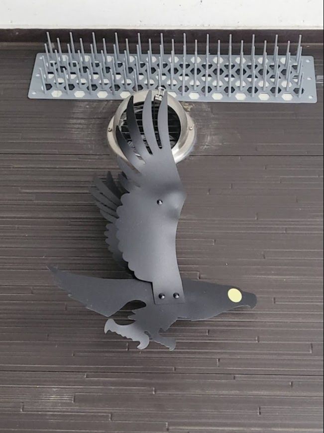 鳥よけネットがあることで、排気口の上に鳥がとまることができなくなりました。風が吹くと鳥よけイーグルがゆらゆらと揺れて、鳥が飛んでいるように見えます。ツバメが巣作りのために飛んでくることもなくなりました。