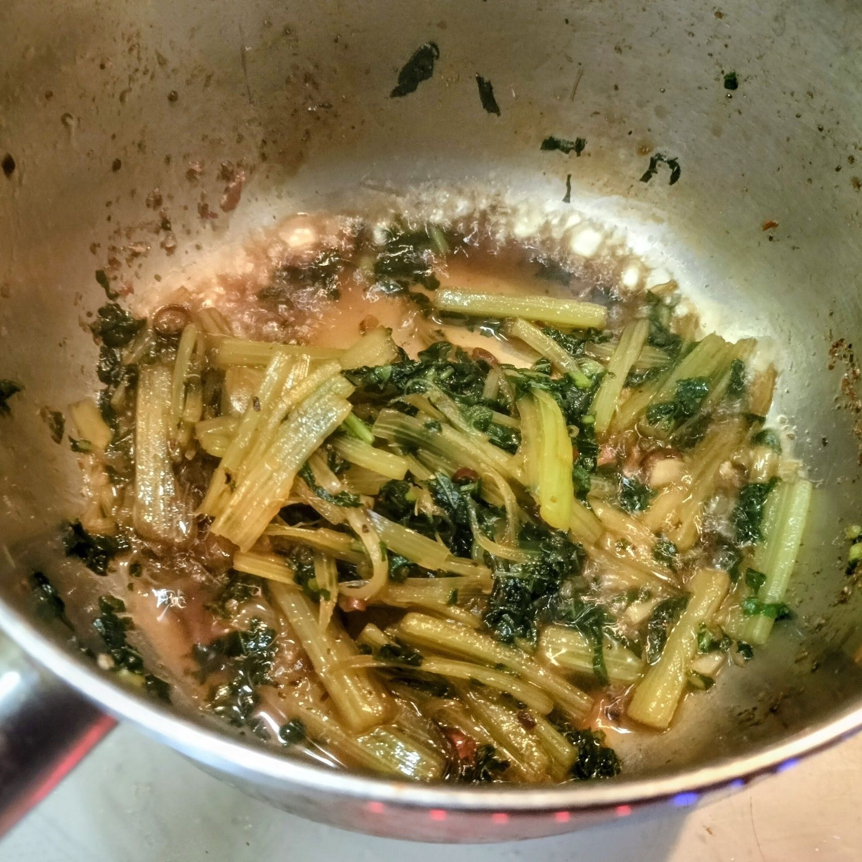 3.手順2の鍋に、ごま油と輪切り唐辛子を入れる→細く切ったふきとふきの葉と材料▲を加えて味を整えながら煮詰める【ふきの甘めのピリ辛甘辛炒め】