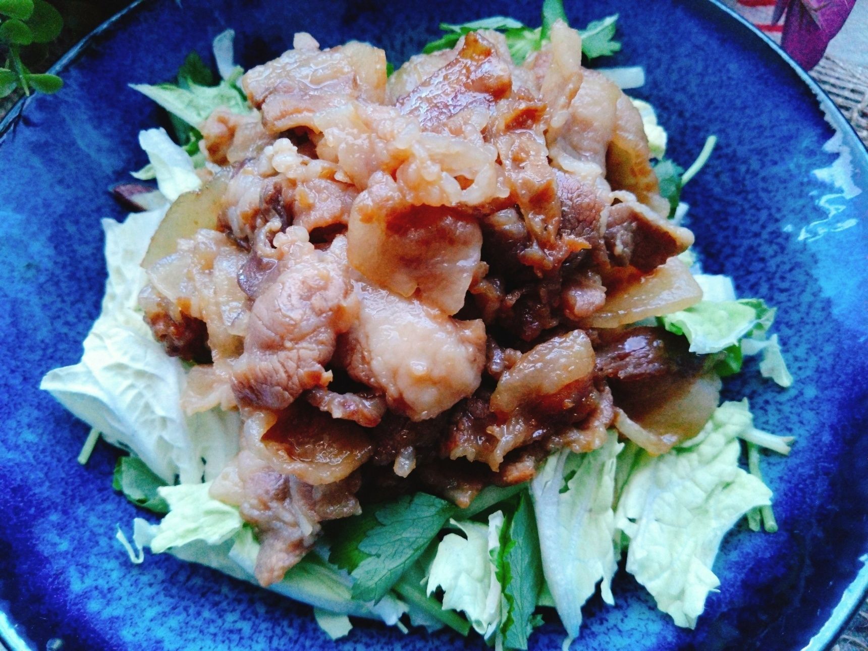 三つ葉とみょうがの香り野菜もプラスさせ、豚肉が熱い内混ぜて程よい食感に。