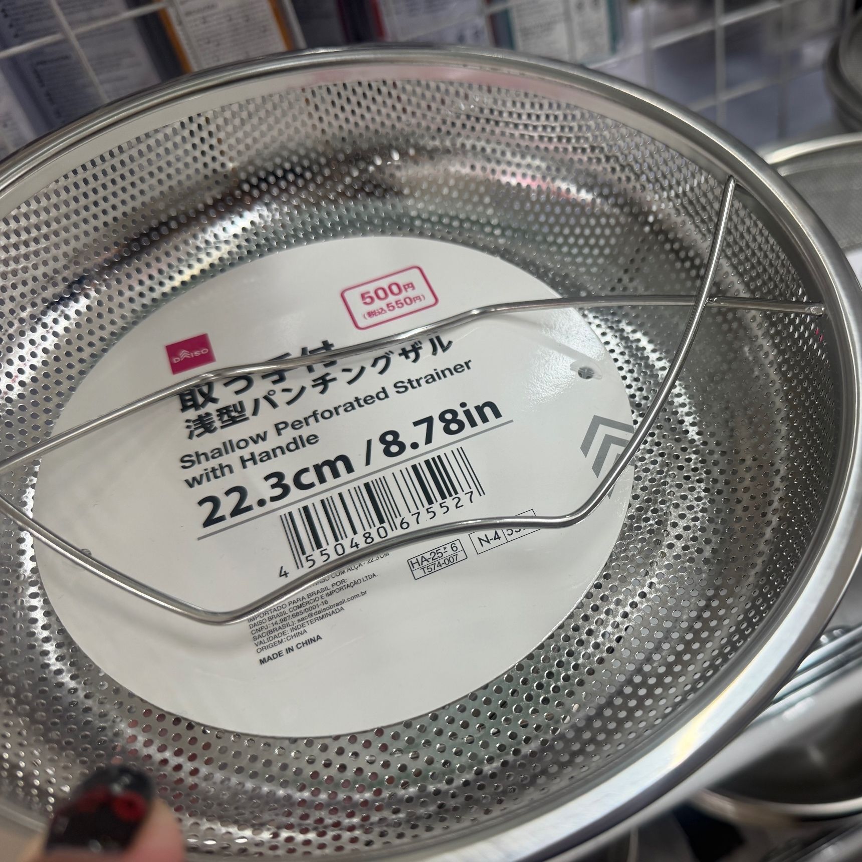 次はザルの目詰まりがしにくいパンチングザルを発見。持ち上げられる取っ手付き。