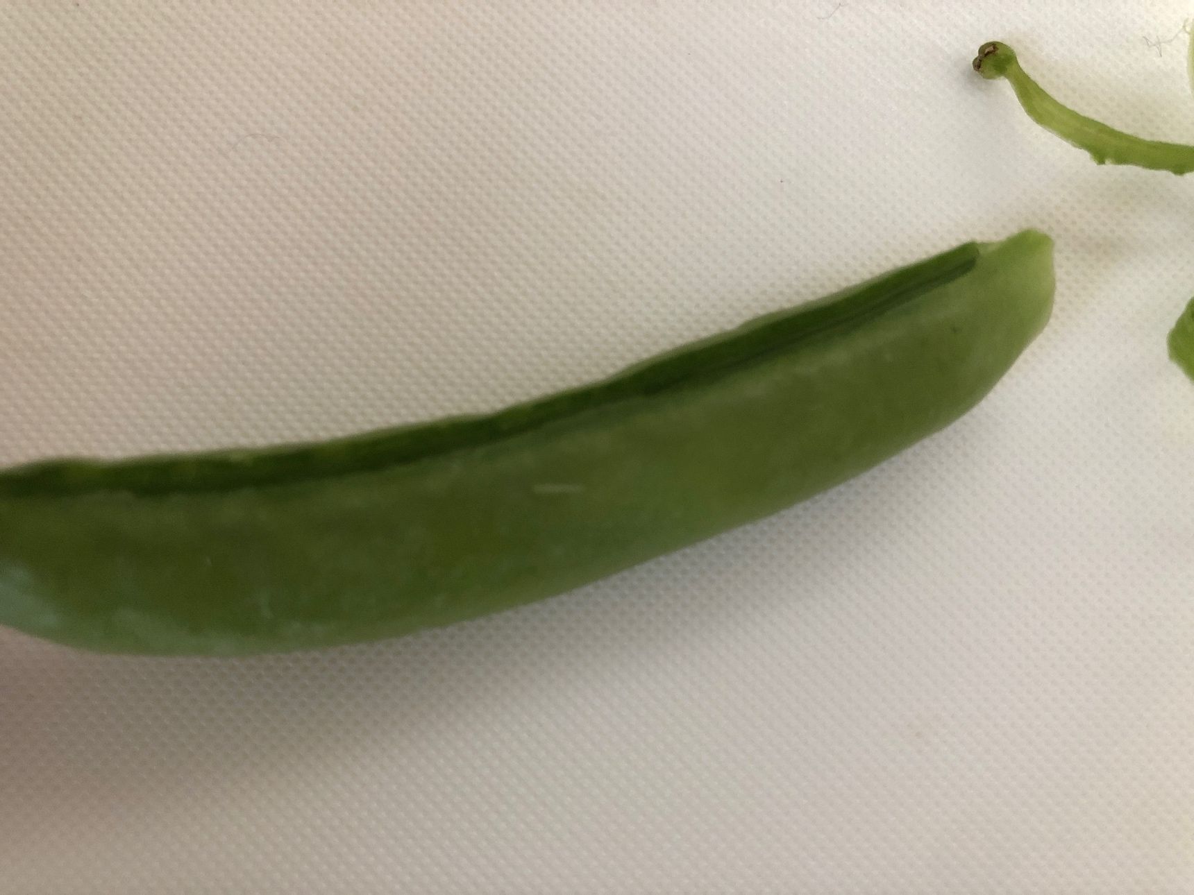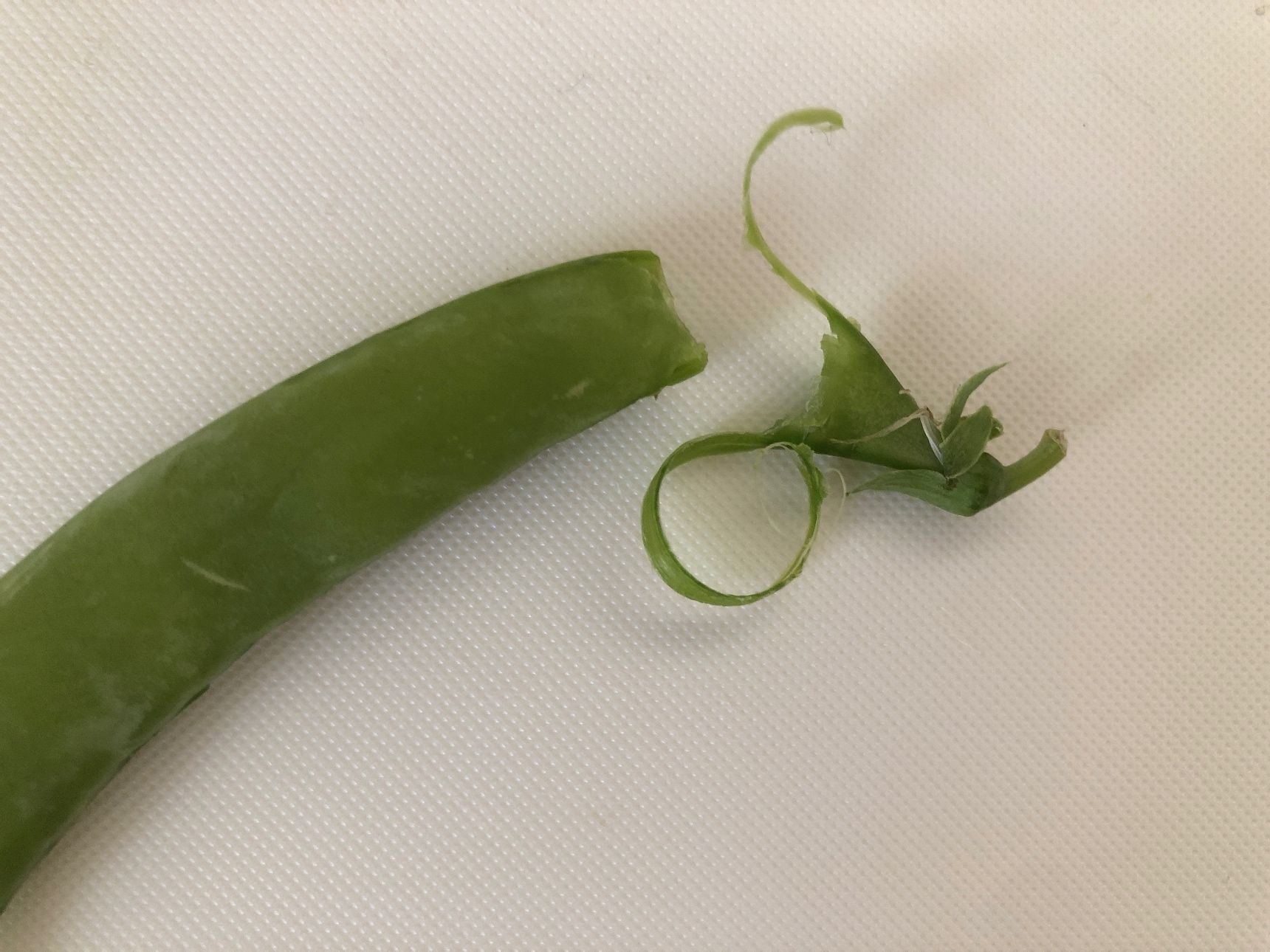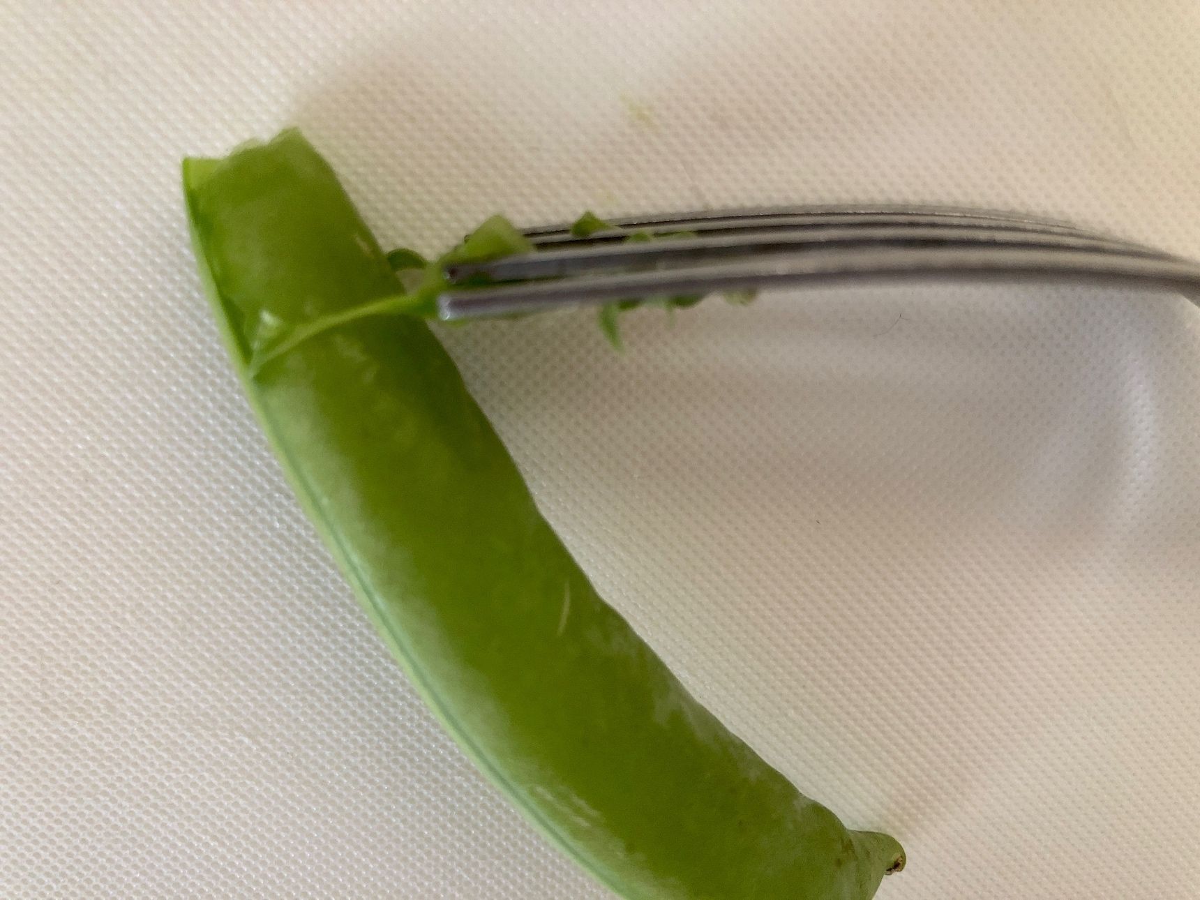 そのままフォークを刺して、スナップエンドウをパキッと折って、フォークをスルスル〜と下に下げます。