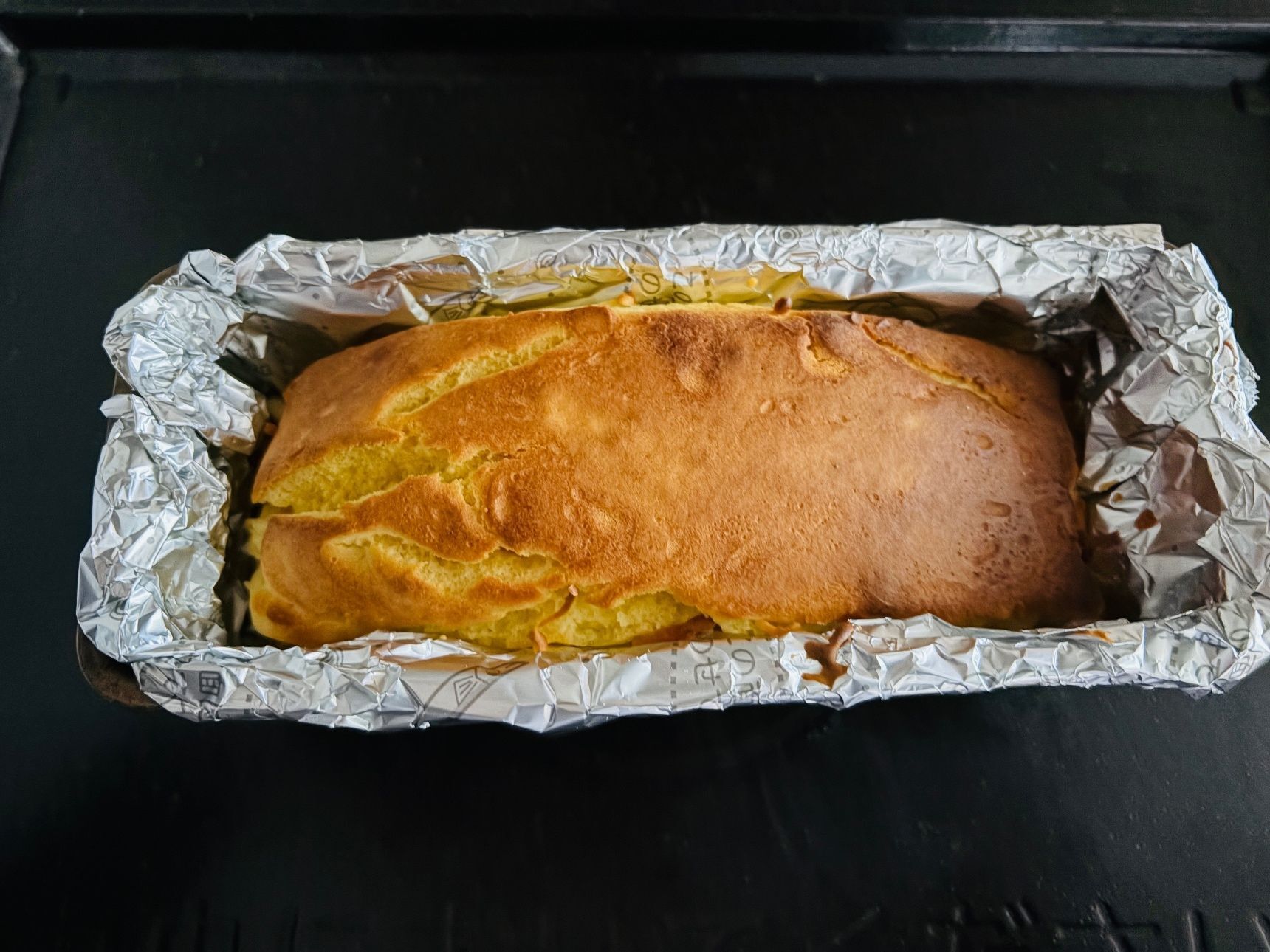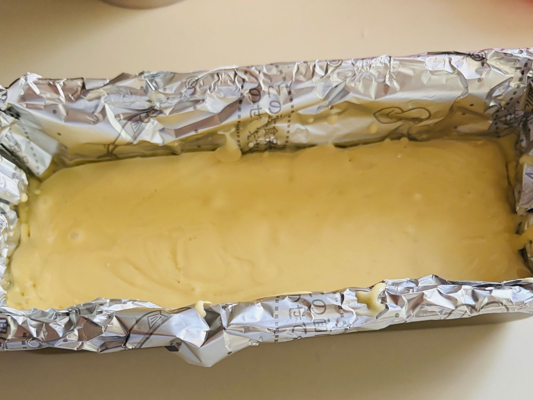 ③パウンドケーキ型にくっつきにくいアルミシートをセットします。②を流し入れます。180度に温めておいたオーブンで25分ほど焼きます。