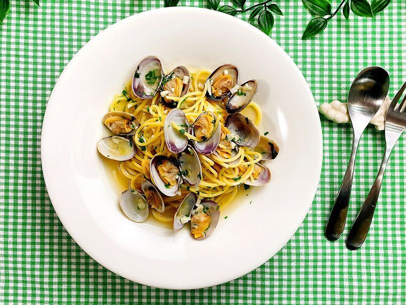 フライパンにオリーブオイル、ニンニクを入れて弱火にかけ、香りが立ってきたら、あさり、白ワイン、水、○ごと万能おだしを加えて中火にしフタをする。あさりの殻が開いたら、スパゲッティ、大葉を加えて全体をよく混ぜ合わせ器に盛り付ける。