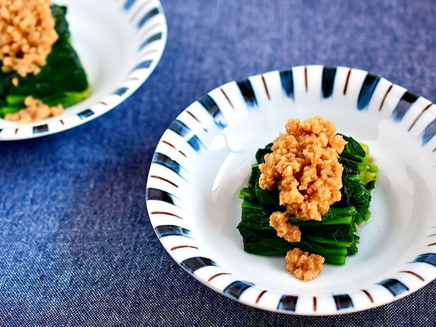 ほうれん草は、塩茹でをして、冷水にさらす。よく絞って食べやすい大きさに切っておく。