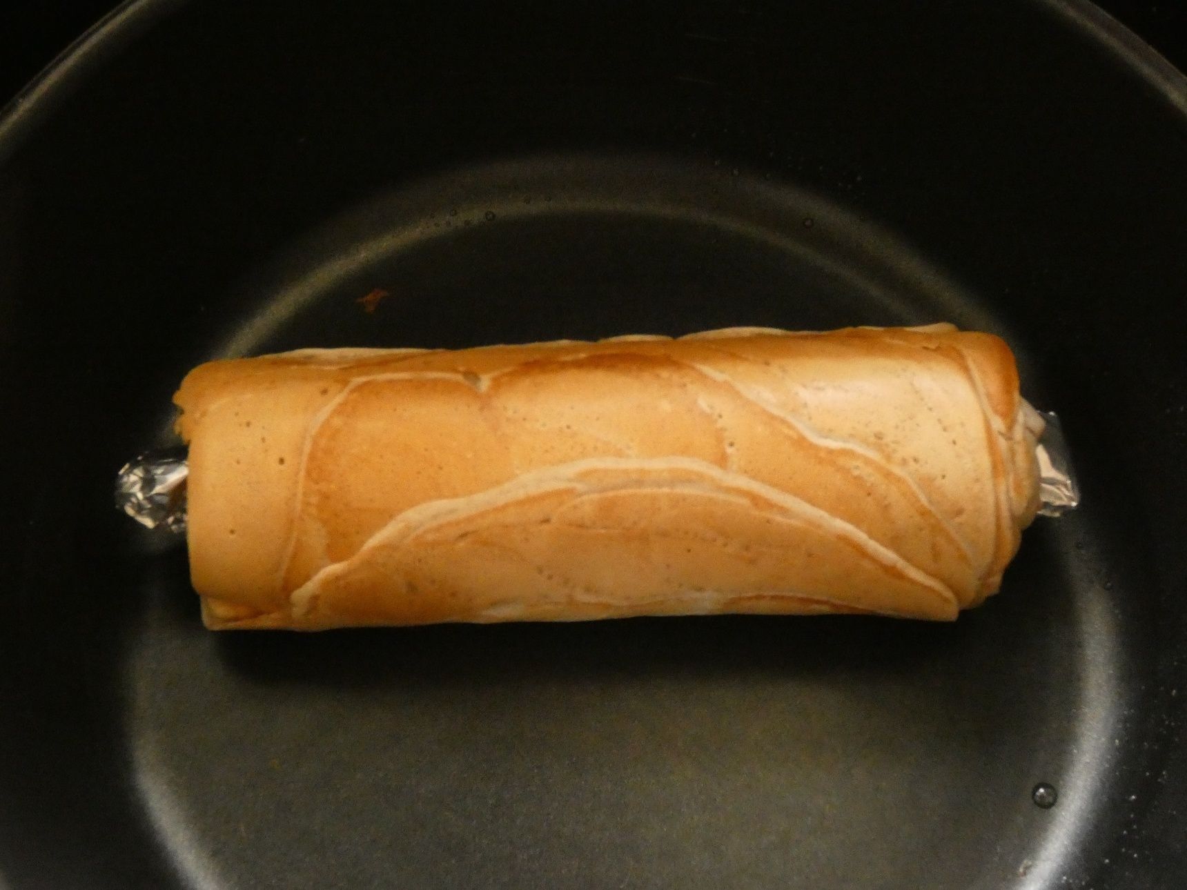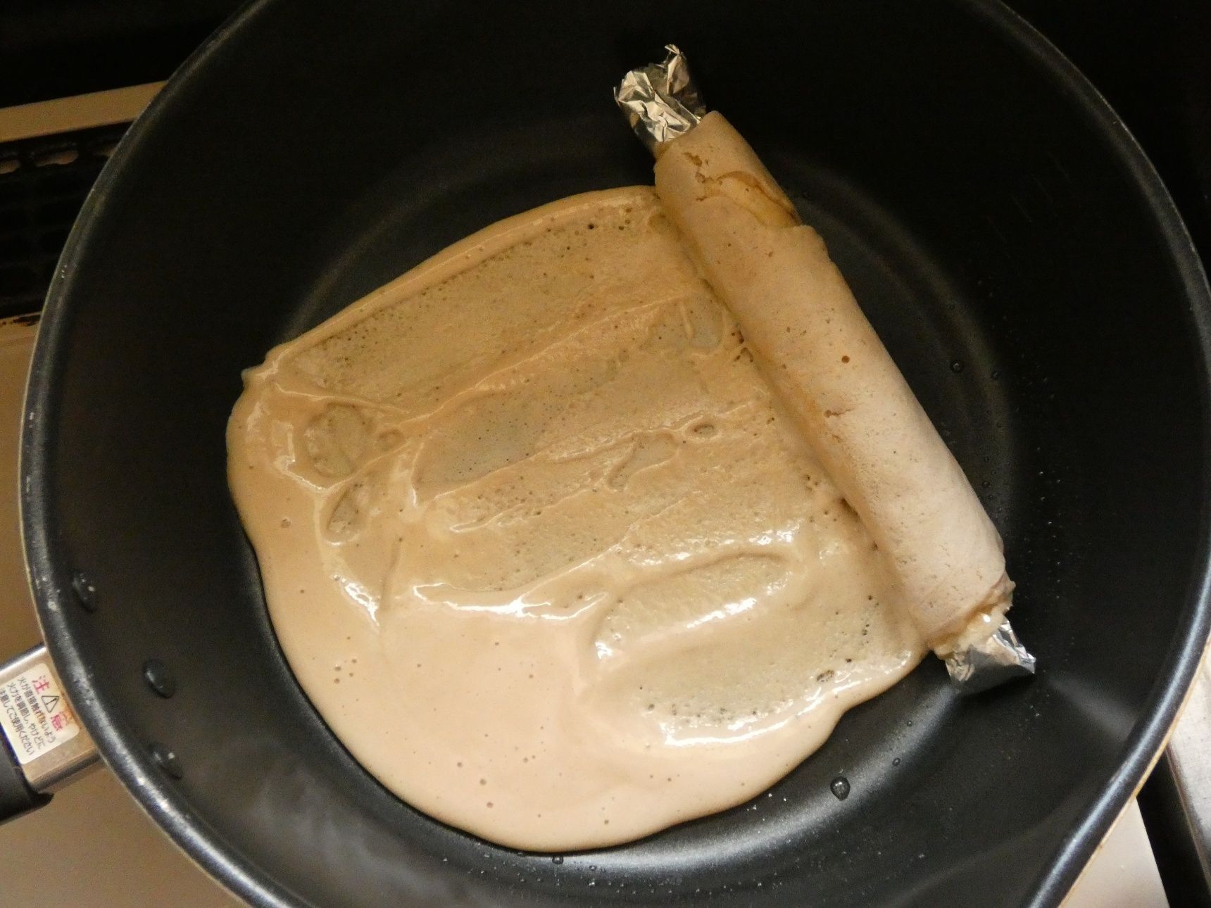 フライパンに油をひき、温まったら生地を流し入れ、アルミホイルを細長くしたものを芯にして巻いていきます。