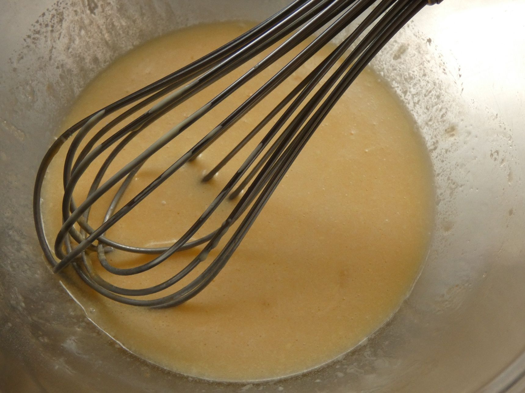 ボウルに卵を入れて溶きほぐし、砂糖、バター、牛乳を混ぜ合わせます。