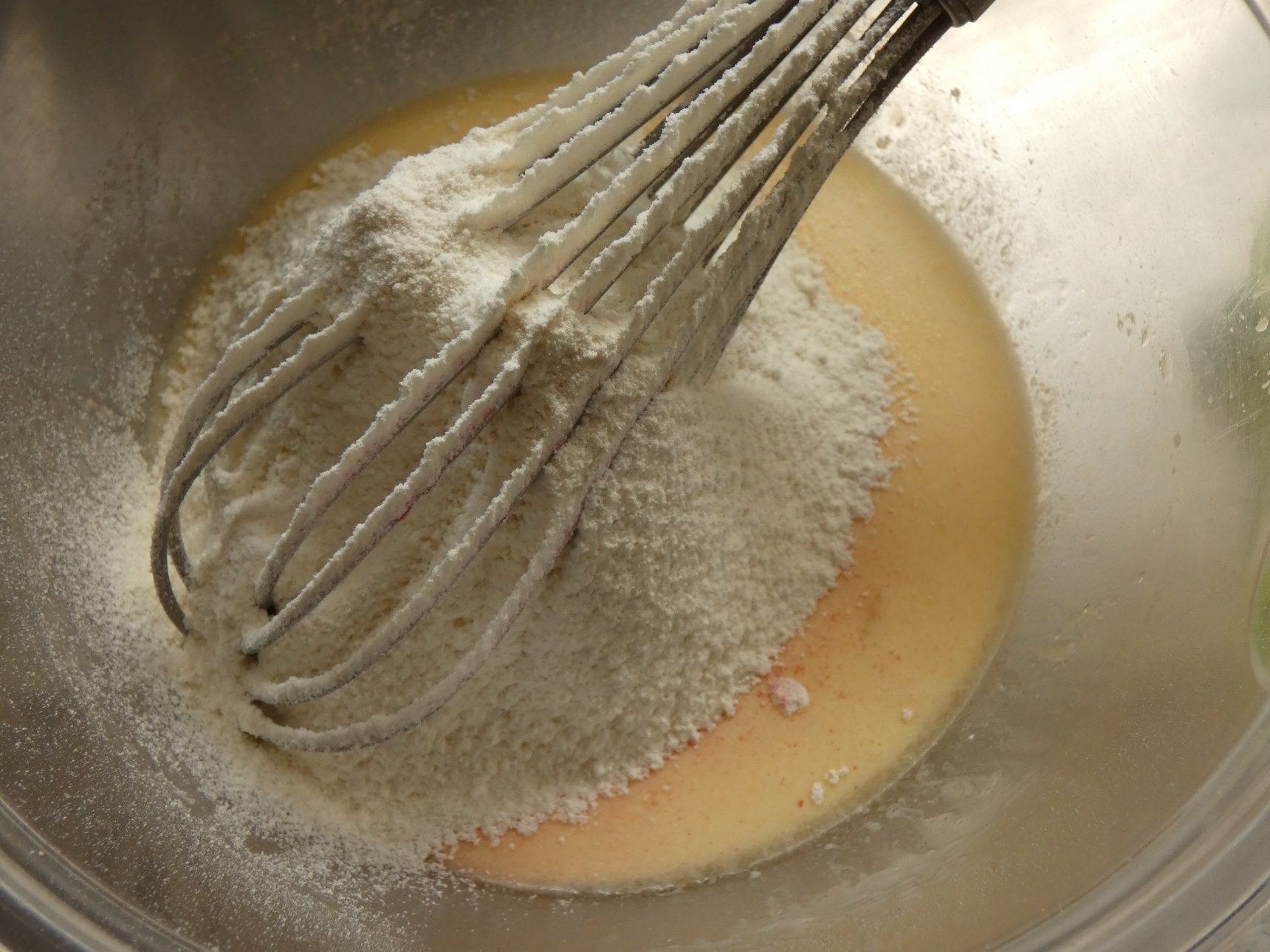 薄力粉とベーキングパウダー、ラズベリーパウダーを2に混ぜ合わせます。