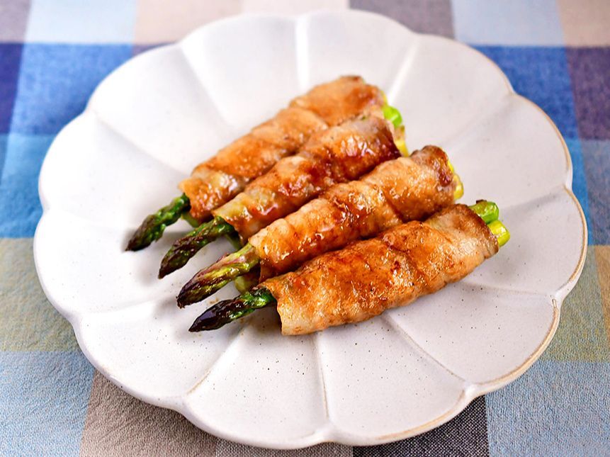 アスパラは、袴を取り、下の方はピーラーで皮をむく。半分に切り、塩、胡椒をして、豚バラ肉を巻いていく。片栗粉を薄くまぶしておく。