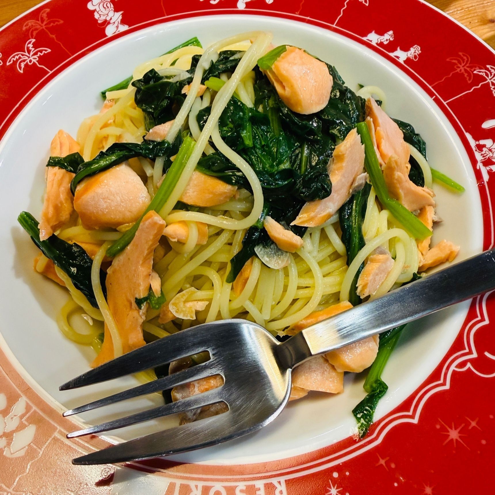 さっそくということで、本日はほうれん草とサーモンのオイルスパゲッティを作ってみたので、ディナーフォークを初おろし!