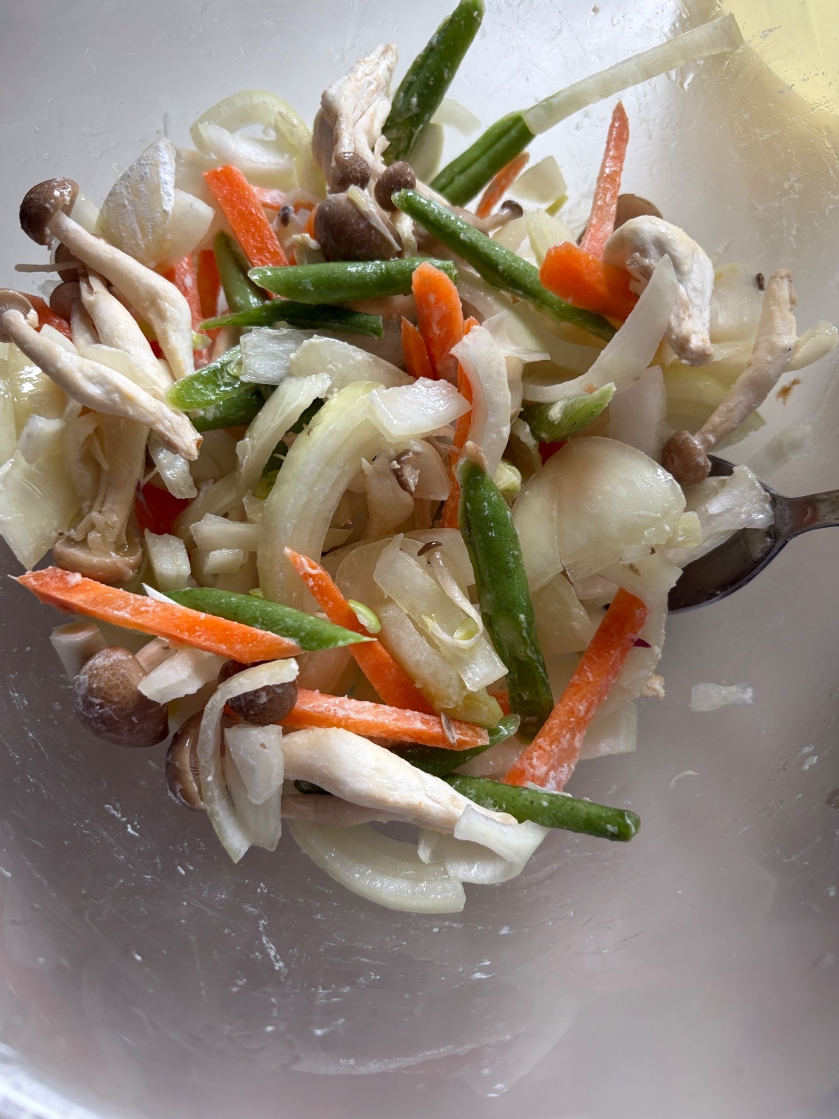 玉ねぎは、縦半分に切って櫛形切り、人参は縦4cmぐらいの短冊切り、インゲンは筋をとり塩をかけ板摺りして斜め切り、ブナシメジは石づきをとって手で割きます。