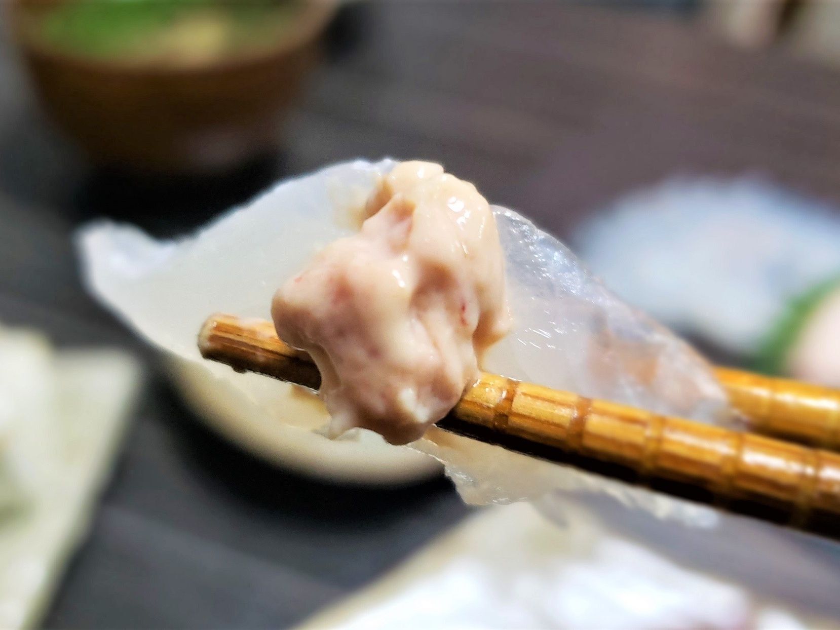 肝は醤油にとかず、身に巻いて食べる贅沢! 先生がボソッと「私だってそんな高級なもの食べられないのに」とつぶやいたのを聞き逃しませんでした(笑) いやいやいやいや、高級って言うか・・・釣ったんで「タダ」です。