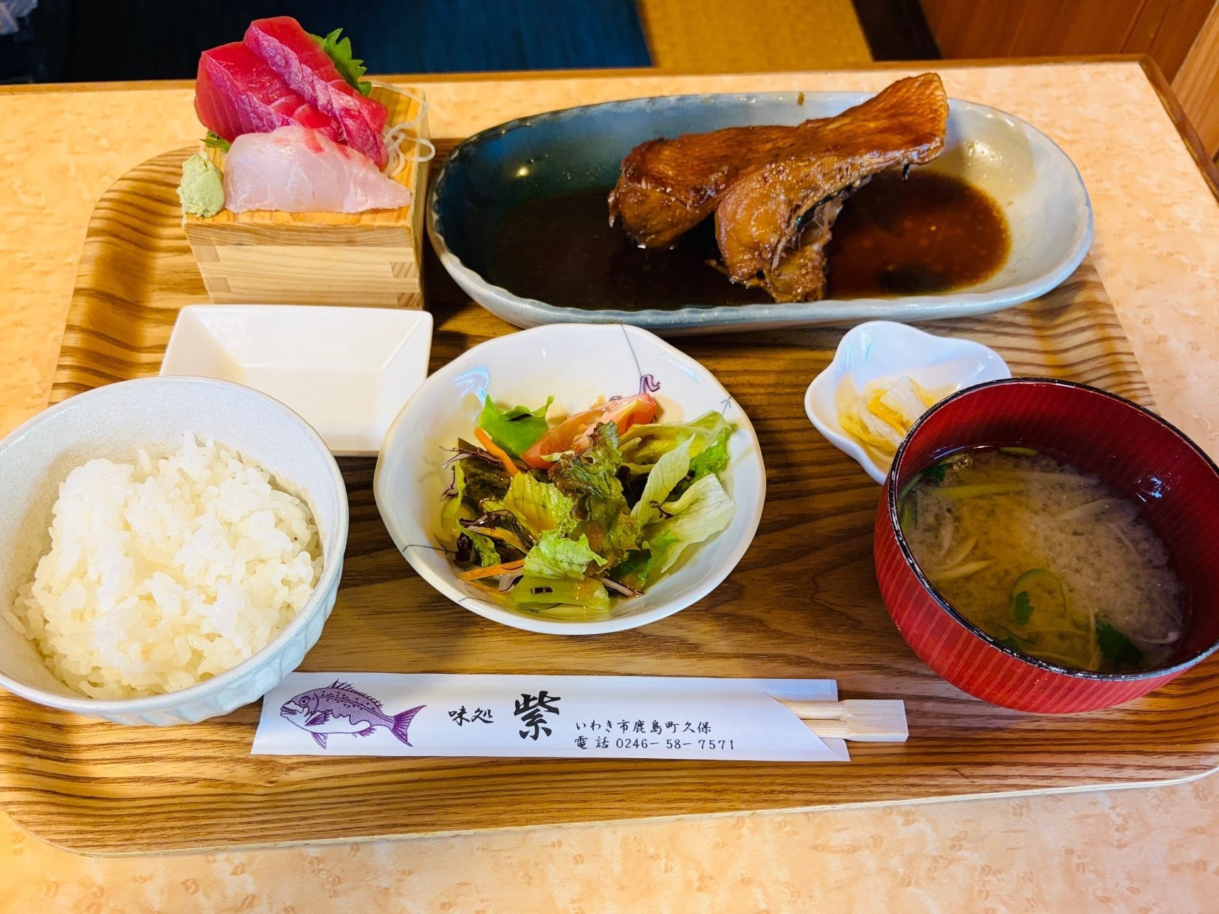 こちらのお好みセットは、お刺身盛りと、本日の煮魚(め抜け)です。