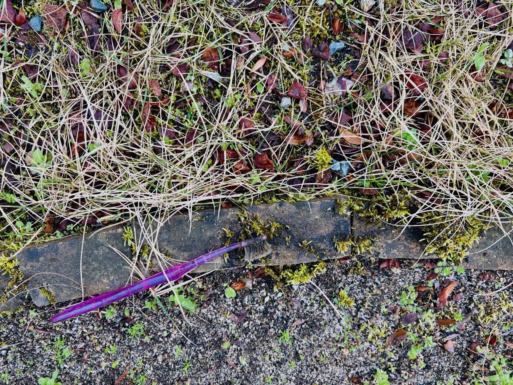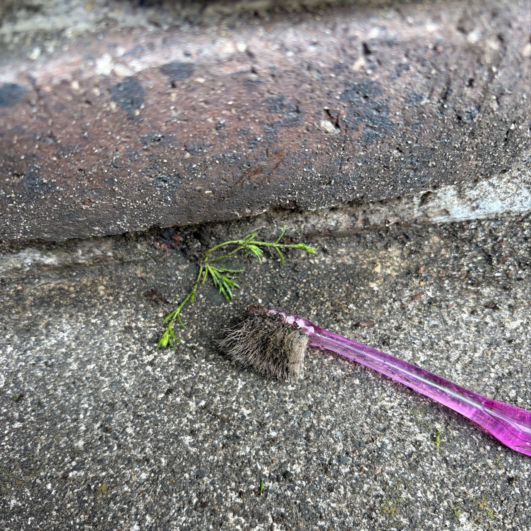 今回とても活躍したのが、「使い捨て歯ブラシ」です。なんでこんなところに雑草が生えるのと、とてもとりづらい雑草には、掻き出すようにブラッシングするだけで簡単に取れます。あとはゴミ袋にポイ。