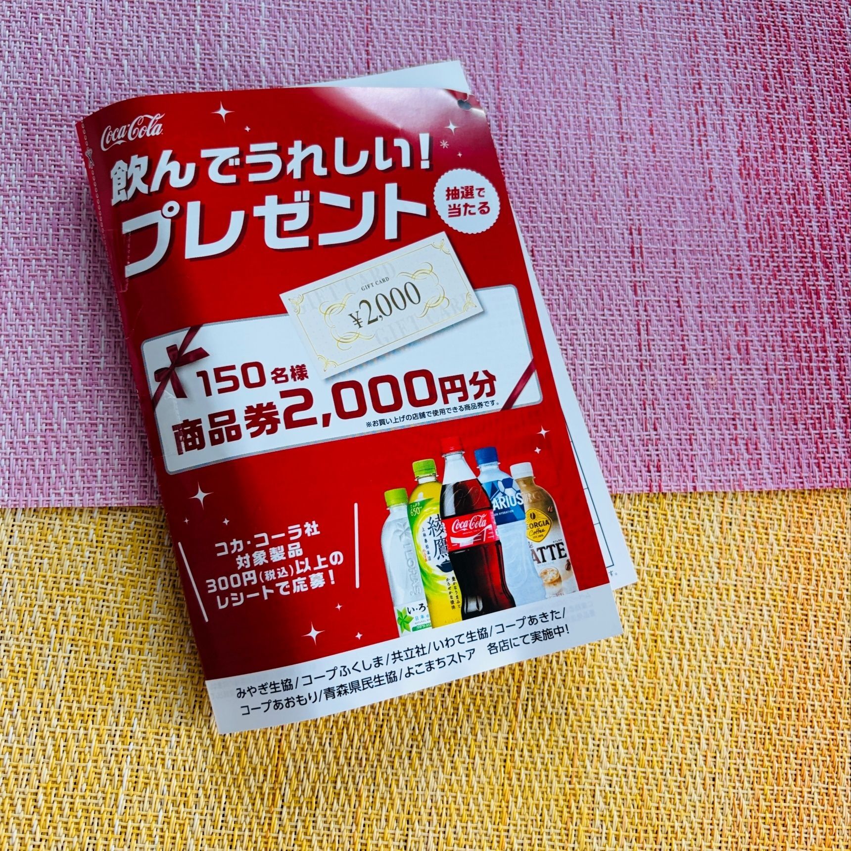 また、備え付けのハガキに、Coca-Cola製品を300円以上買ったレシートを貼って送ると、抽選で150名の方に2000円のギフトカードが当たるキャンペーンも。
