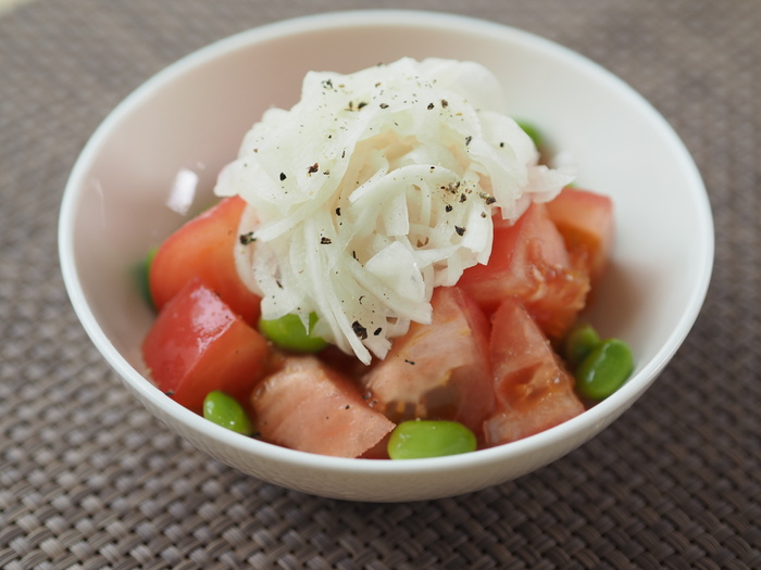 このサラダは酢玉ねぎをそのまま使ったレシピ。酢玉ねぎ自体にしっかり味がついているので、そのままかけただけでもドレッシング感覚で食べられます。酢玉ねぎの酸味がトマトと枝豆の甘みをより立たせてくれて美味しい☆しかもオイルが入っていないので通常のドレッシングよりもかなりヘルシーです。