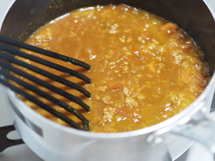2.少し煮立てたらカレー粉・ウスターソース・ケチャップ加えてさらにひと煮立ちさせれば完成!