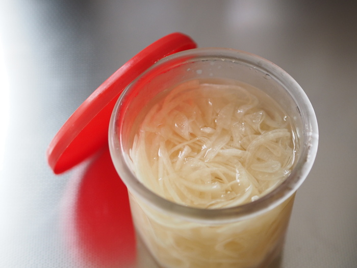 1.玉ねぎの皮をむいて薄くスライスして、15分以上そのまま置いておきます。