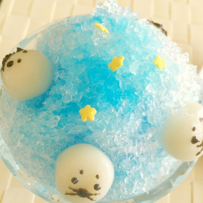 カキ氷の周りに白玉アザラシを盛り付けていきます。落ちやすいのでしっかりと固定して下さい。
